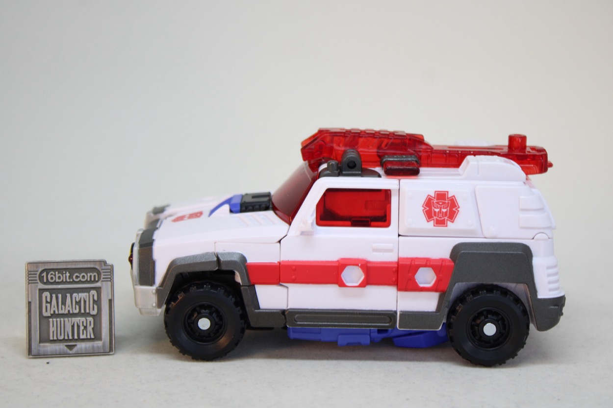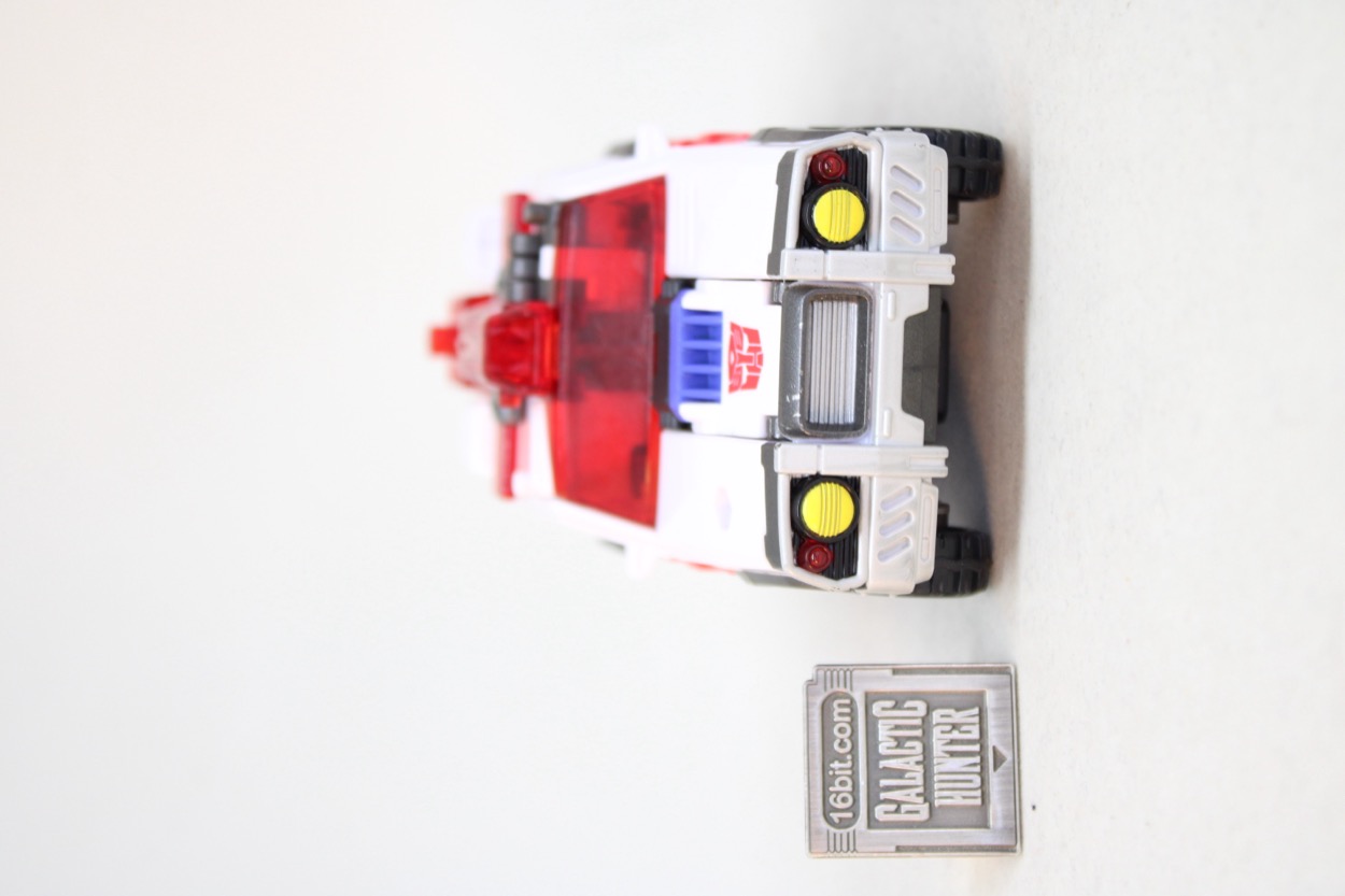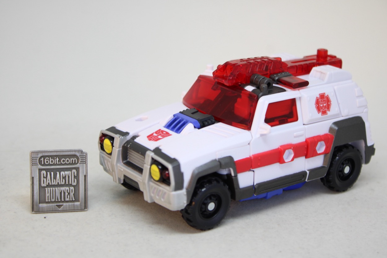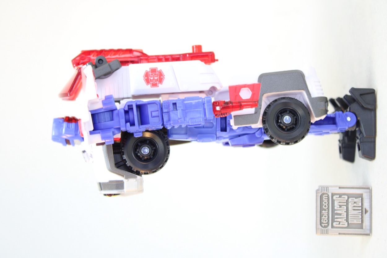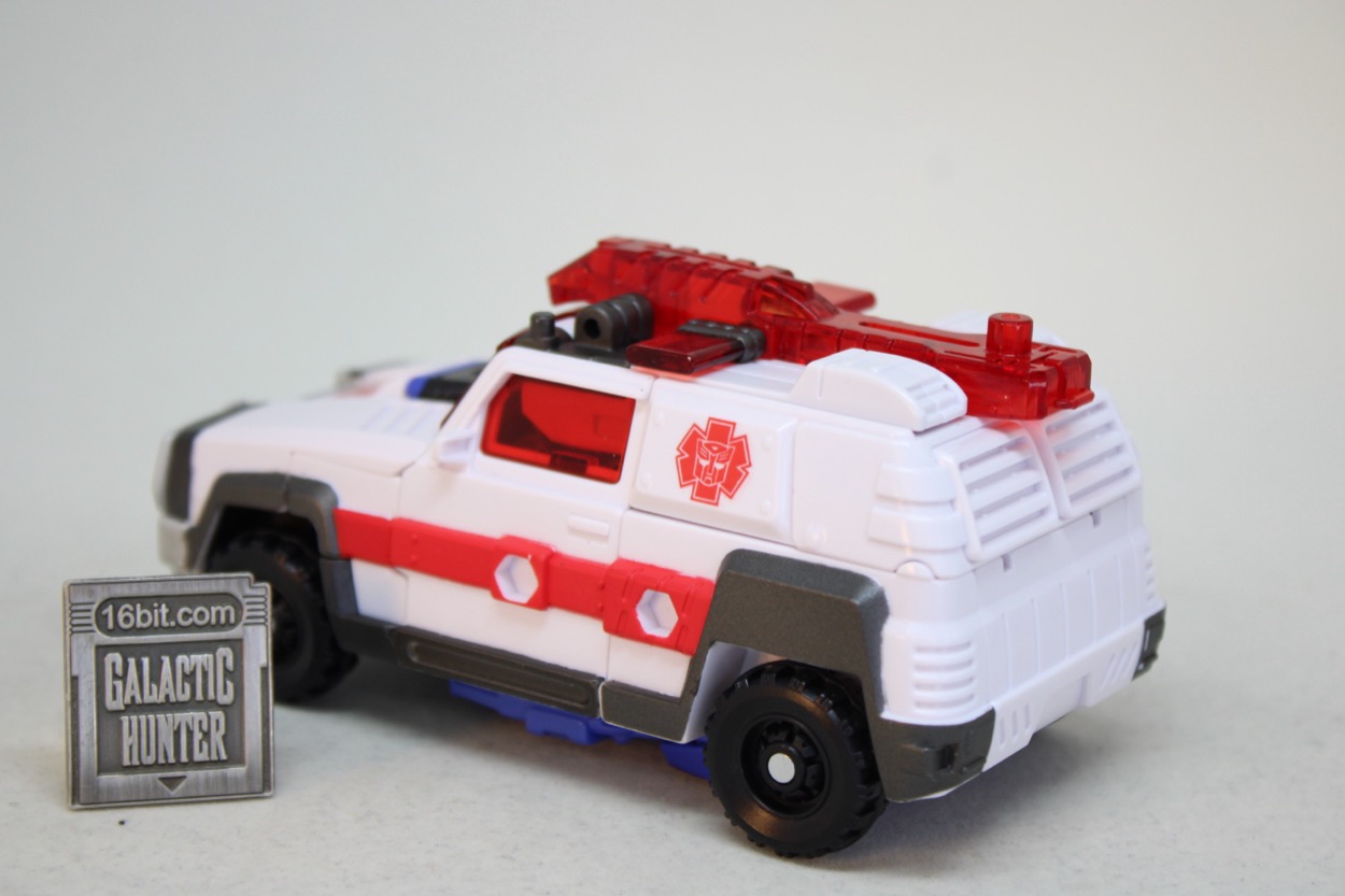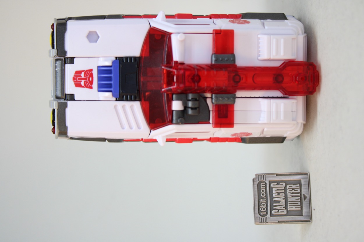 The vehicle is smaller than the original, and lacks almost all gimmicks. There's a 5mm socket on the hood of the vehicle, plus some decent paint. The wheels spin perfectly well, and there are a lot of clear red bits to be careful with over the long haul. I think this is what fans want in an Autobot SUV, but it's a little smaller and it doesn't really give you a lot of reason to play with it. A few 5mm pegs and ports are here to use as hooks with your own Longarm or a future new Longarm should Hasbro release it. The red crosses have been replaced by the Autobot medic symbol, as the actual Red Cross organization does not want their mark used anywhere ever.