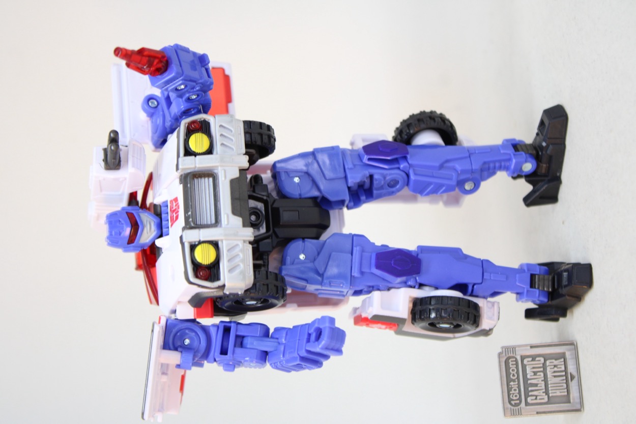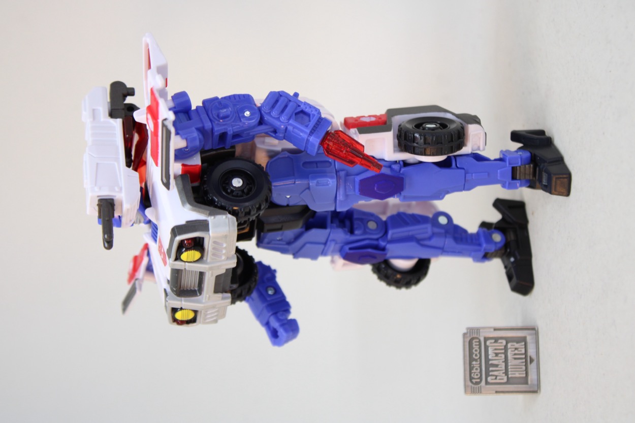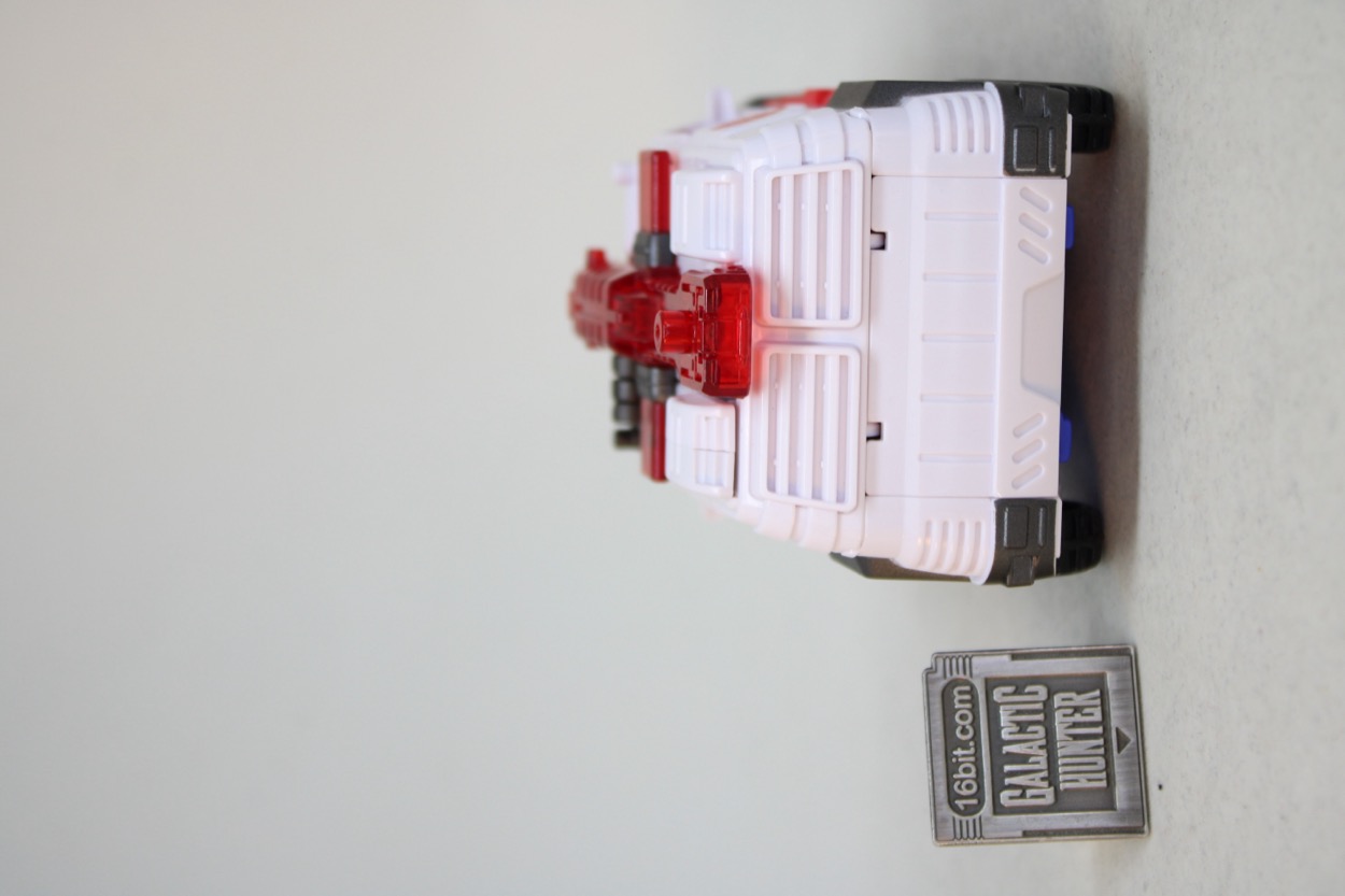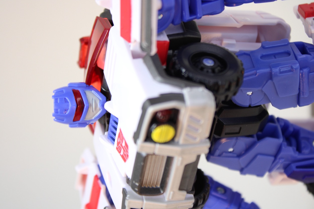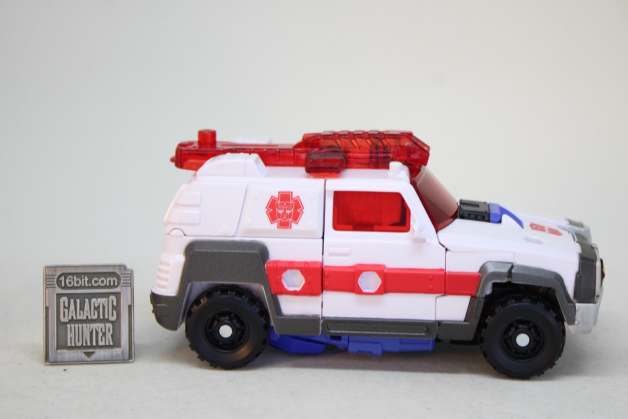 The vehicle is smaller than the original, and lacks almost all gimmicks. There's a 5mm socket on the hood of the vehicle, plus some decent paint. The wheels spin perfectly well, and there are a lot of clear red bits to be careful with over the long haul. I think this is what fans want in an Autobot SUV, but it's a little smaller and it doesn't really give you a lot of reason to play with it. A few 5mm pegs and ports are here to use as hooks with your own Longarm or a future new Longarm should Hasbro release it. The red crosses have been replaced by the Autobot medic symbol, as the actual Red Cross organization does not want their mark used anywhere ever.