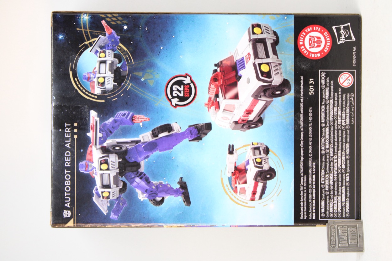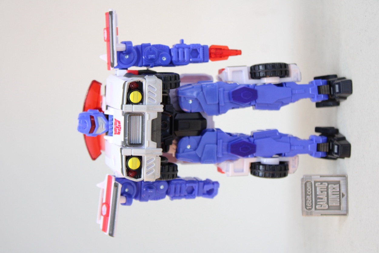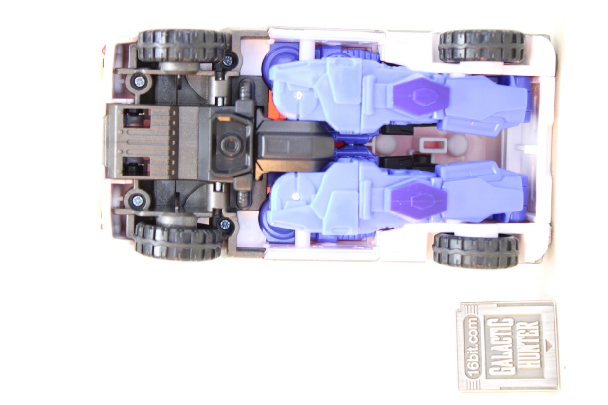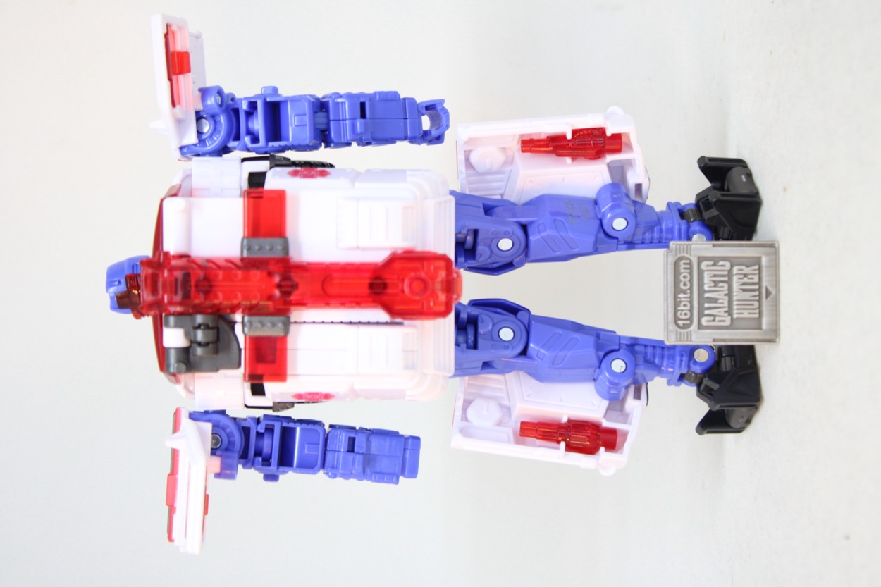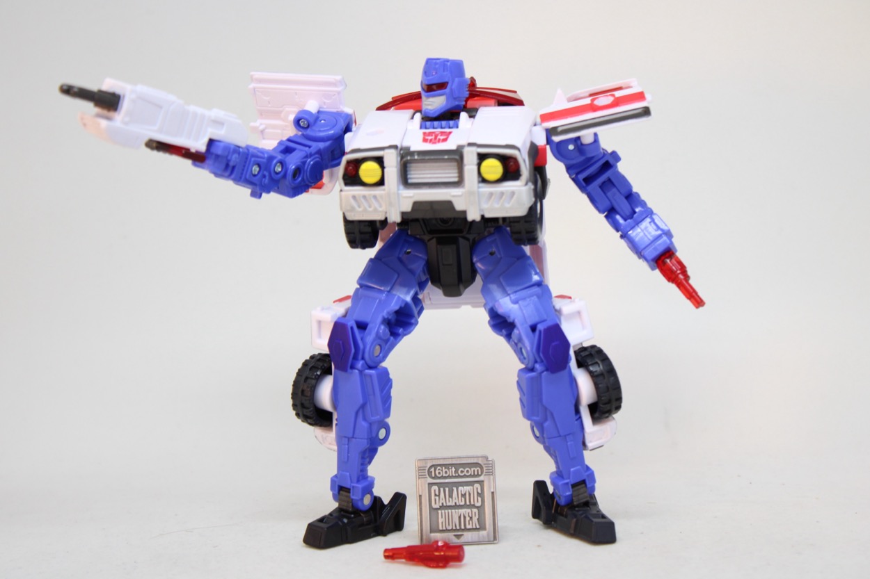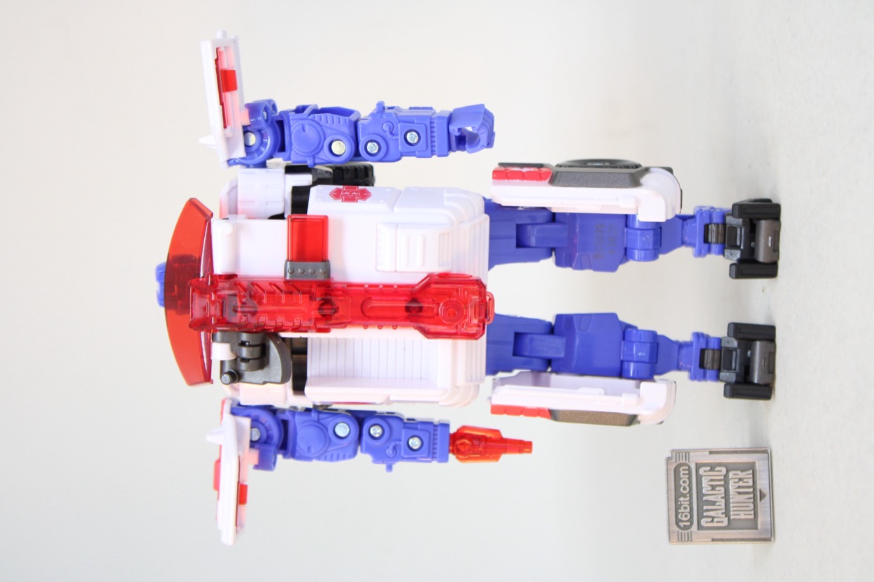 The vehicle is smaller than the original, and lacks almost all gimmicks. There's a 5mm socket on the hood of the vehicle, plus some decent paint. The wheels spin perfectly well, and there are a lot of clear red bits to be careful with over the long haul. I think this is what fans want in an Autobot SUV, but it's a little smaller and it doesn't really give you a lot of reason to play with it. A few 5mm pegs and ports are here to use as hooks with your own Longarm or a future new Longarm should Hasbro release it. The red crosses have been replaced by the Autobot medic symbol, as the actual Red Cross organization does not want their mark used anywhere ever.