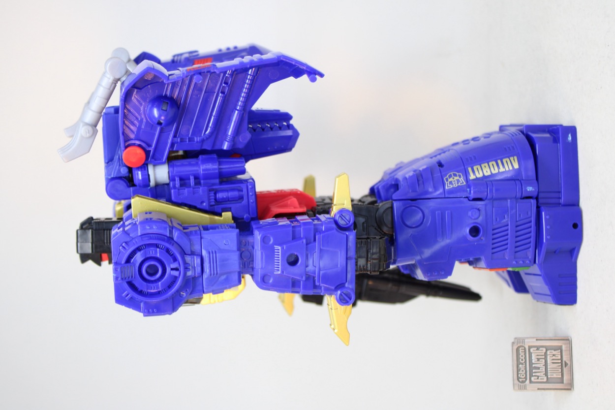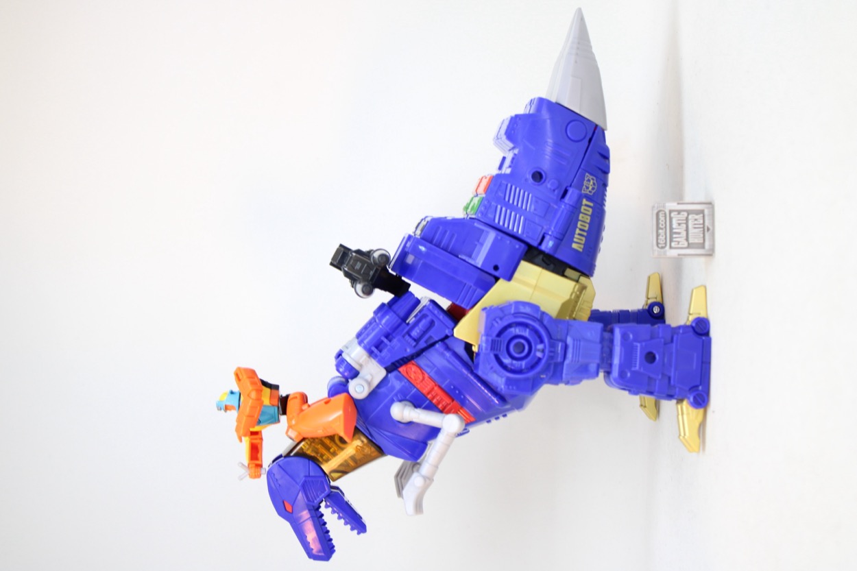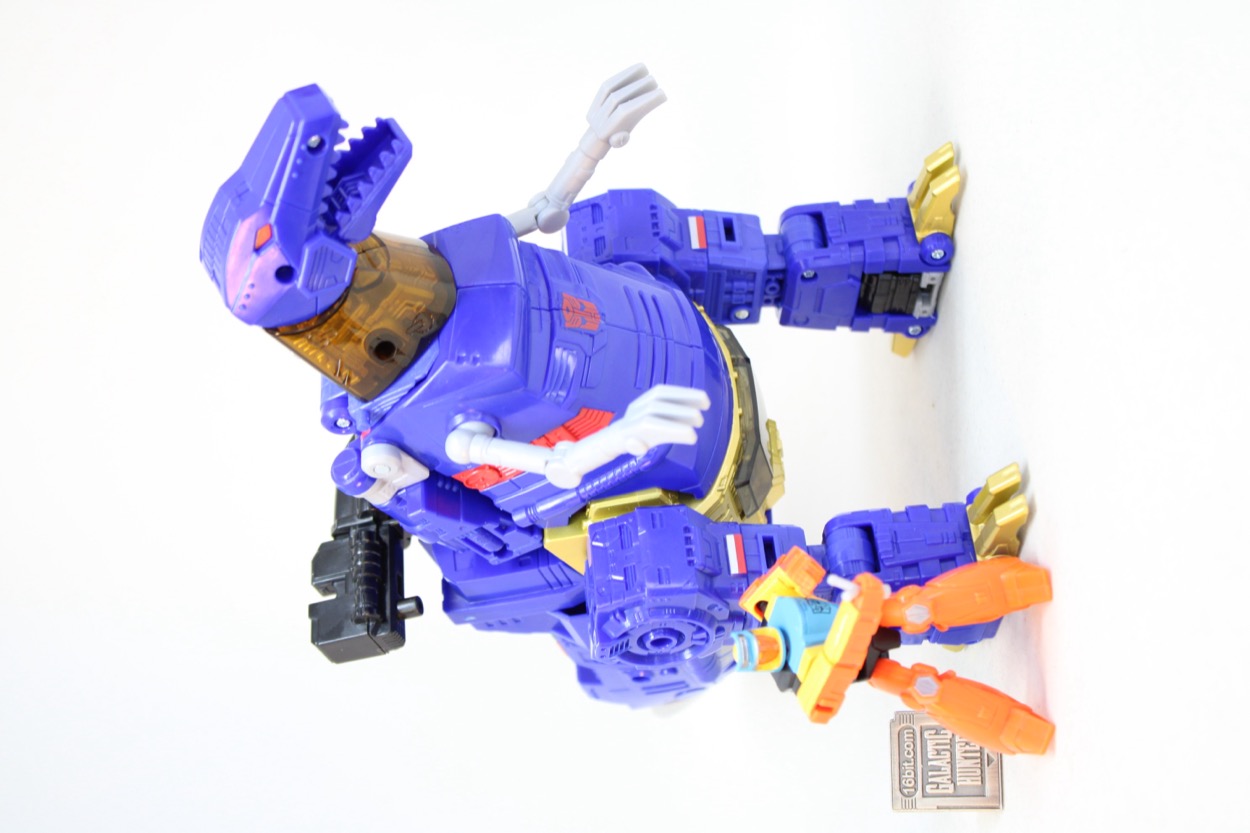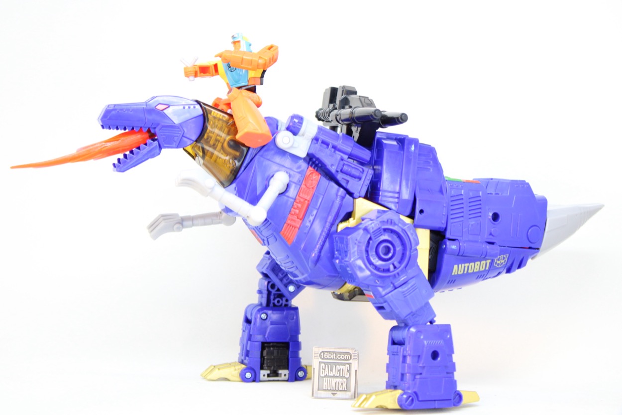 Hasbro's knack for planning ahead really shows on Grimlock's Tyrannosaurus Rex mode. The neck is clear and you can see the interiors a bit - just like the original toy. There's no silver, but you get some gold paint and some colorful highlights that recall (but do not replicate) the original toy's stickers. His eyes are red, his jaws open, and there's a G1 Autobot symbol on his chest. My main gripe is that the back hunk of dinosaur doesn't stay together too well without using his blaster to clip it in place, but otherwise, it's quite good. Wheelie can ride on his neck too.