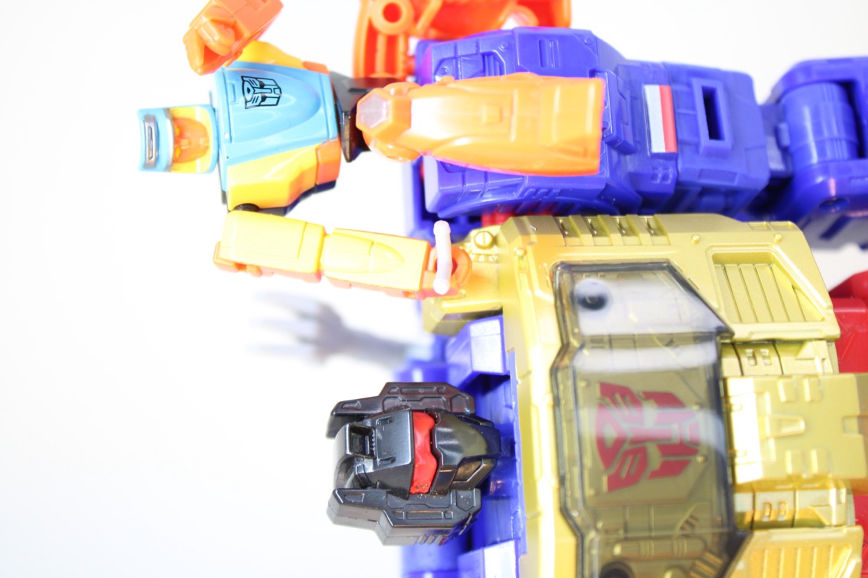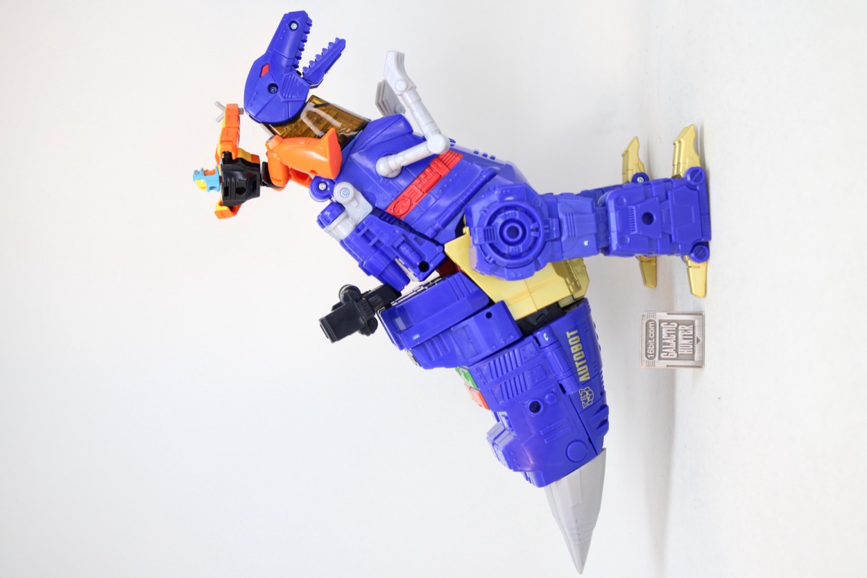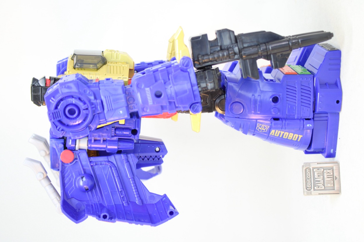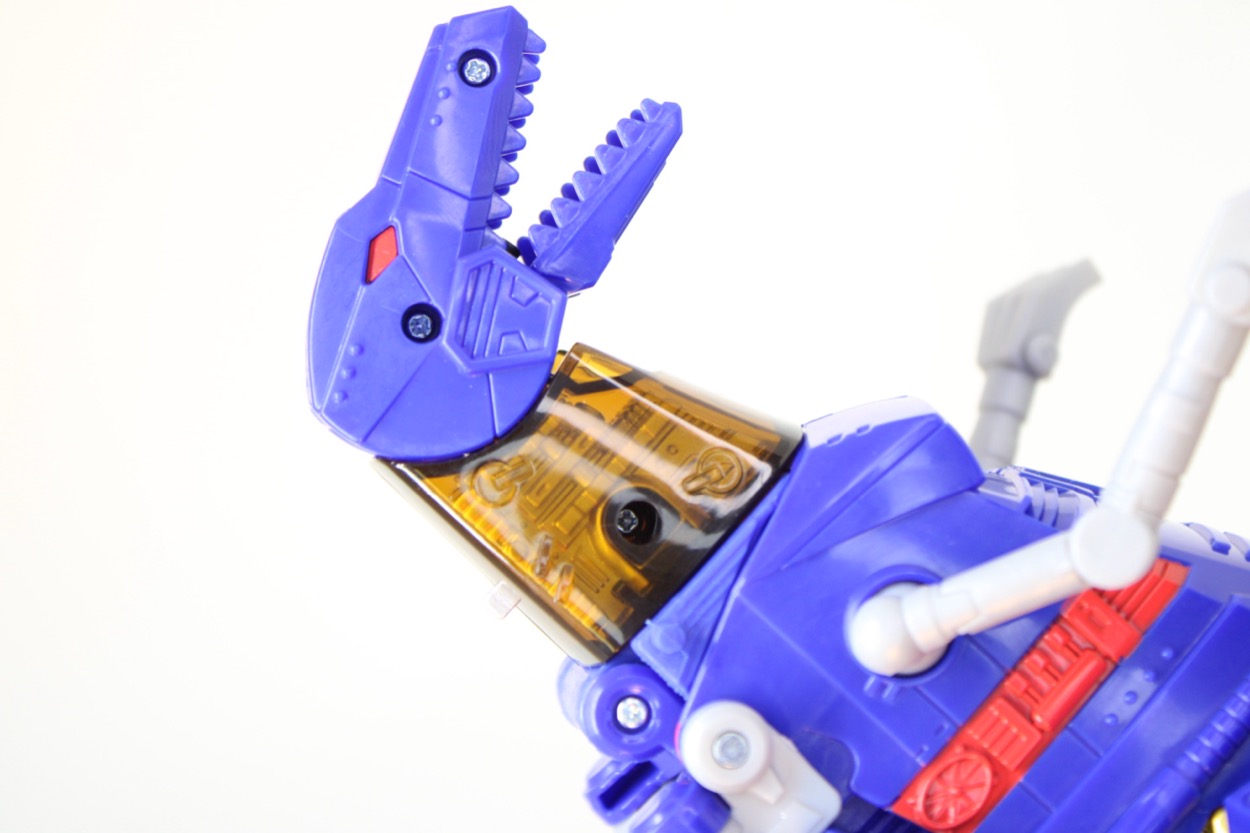 Hasbro's knack for planning ahead really shows on Grimlock's Tyrannosaurus Rex mode. The neck is clear and you can see the interiors a bit - just like the original toy. There's no silver, but you get some gold paint and some colorful highlights that recall (but do not replicate) the original toy's stickers. His eyes are red, his jaws open, and there's a G1 Autobot symbol on his chest. My main gripe is that the back hunk of dinosaur doesn't stay together too well without using his blaster to clip it in place, but otherwise, it's quite good. Wheelie can ride on his neck too.