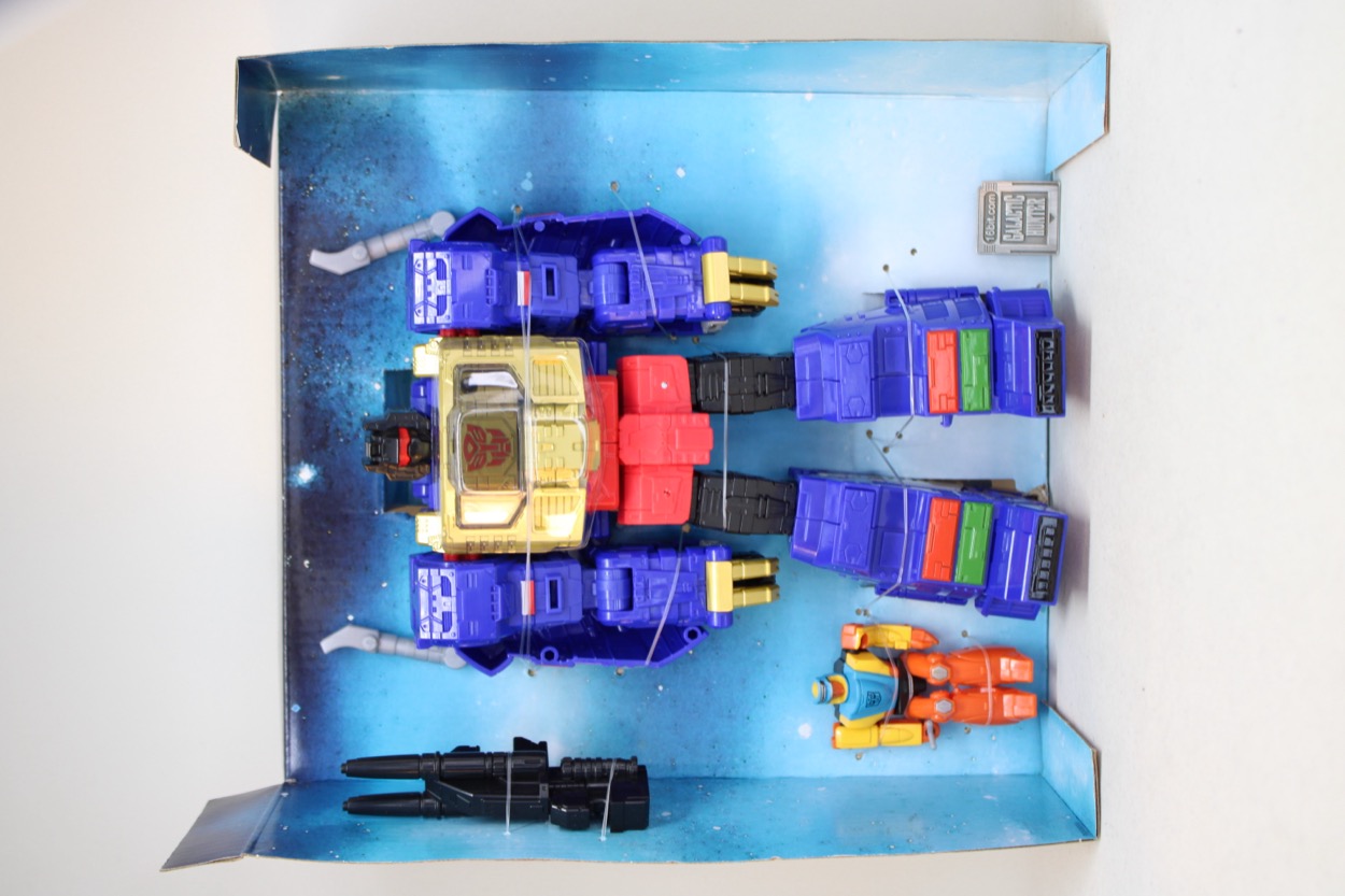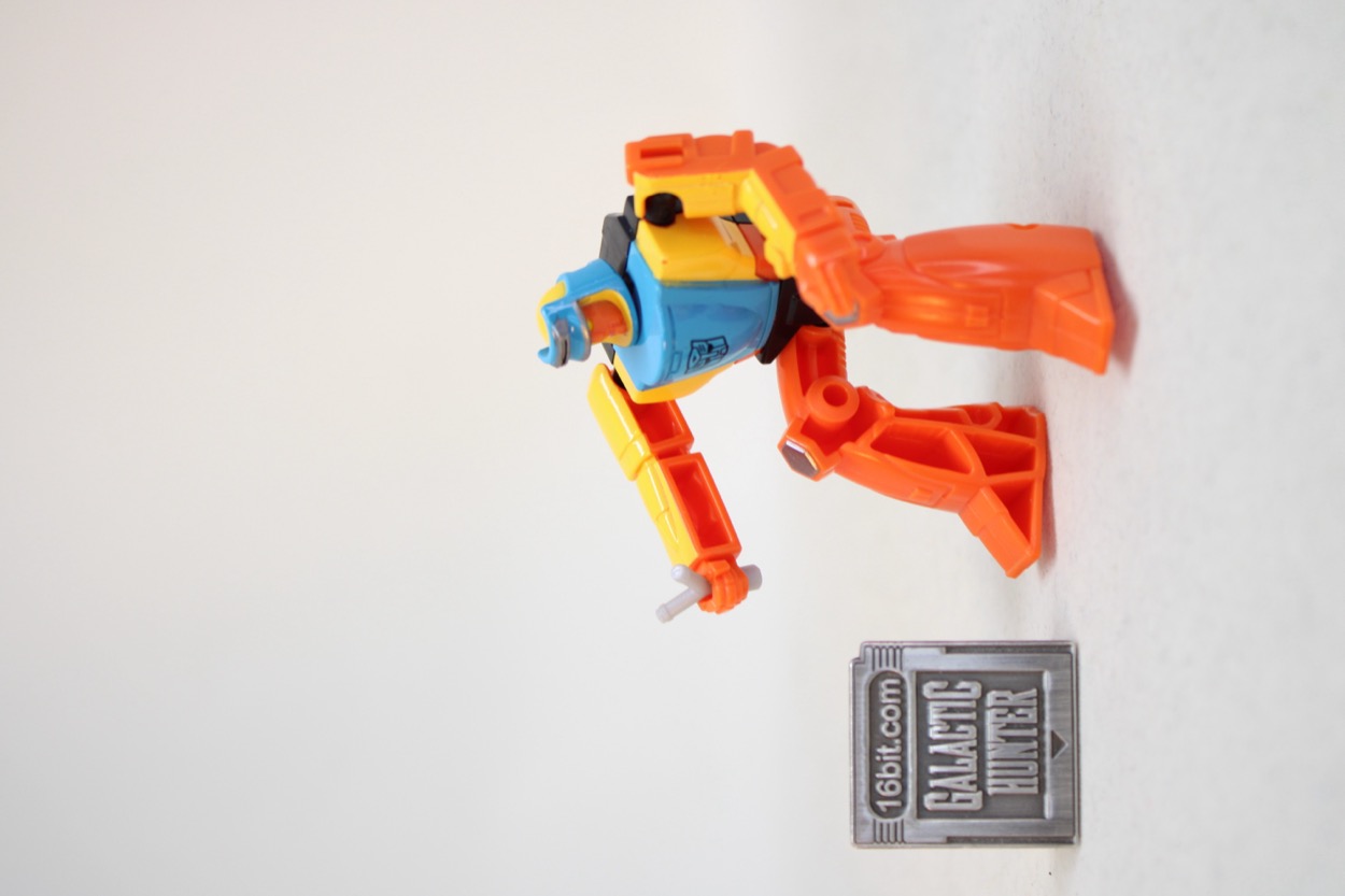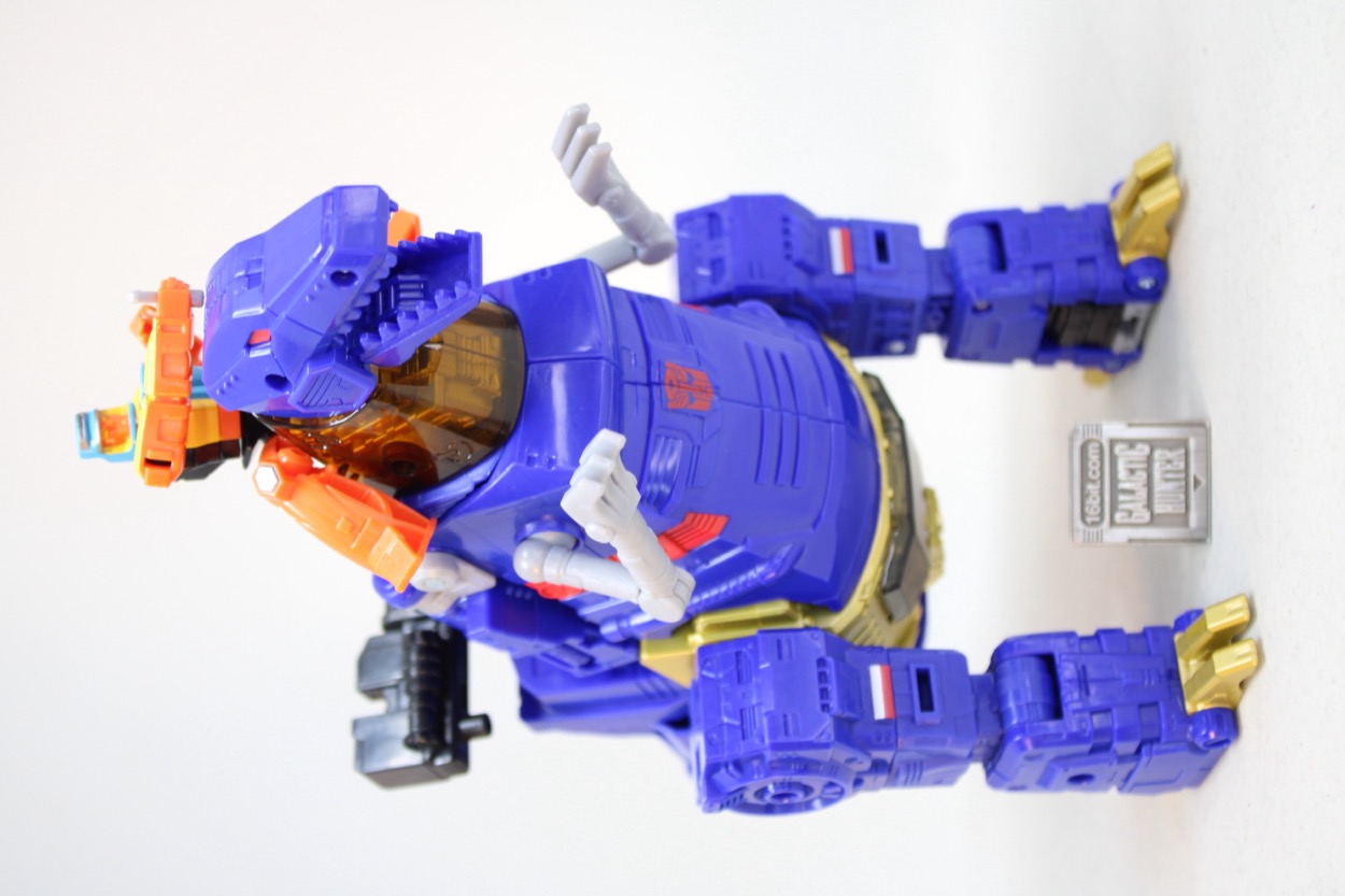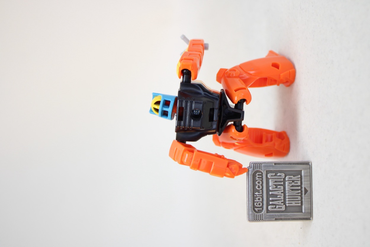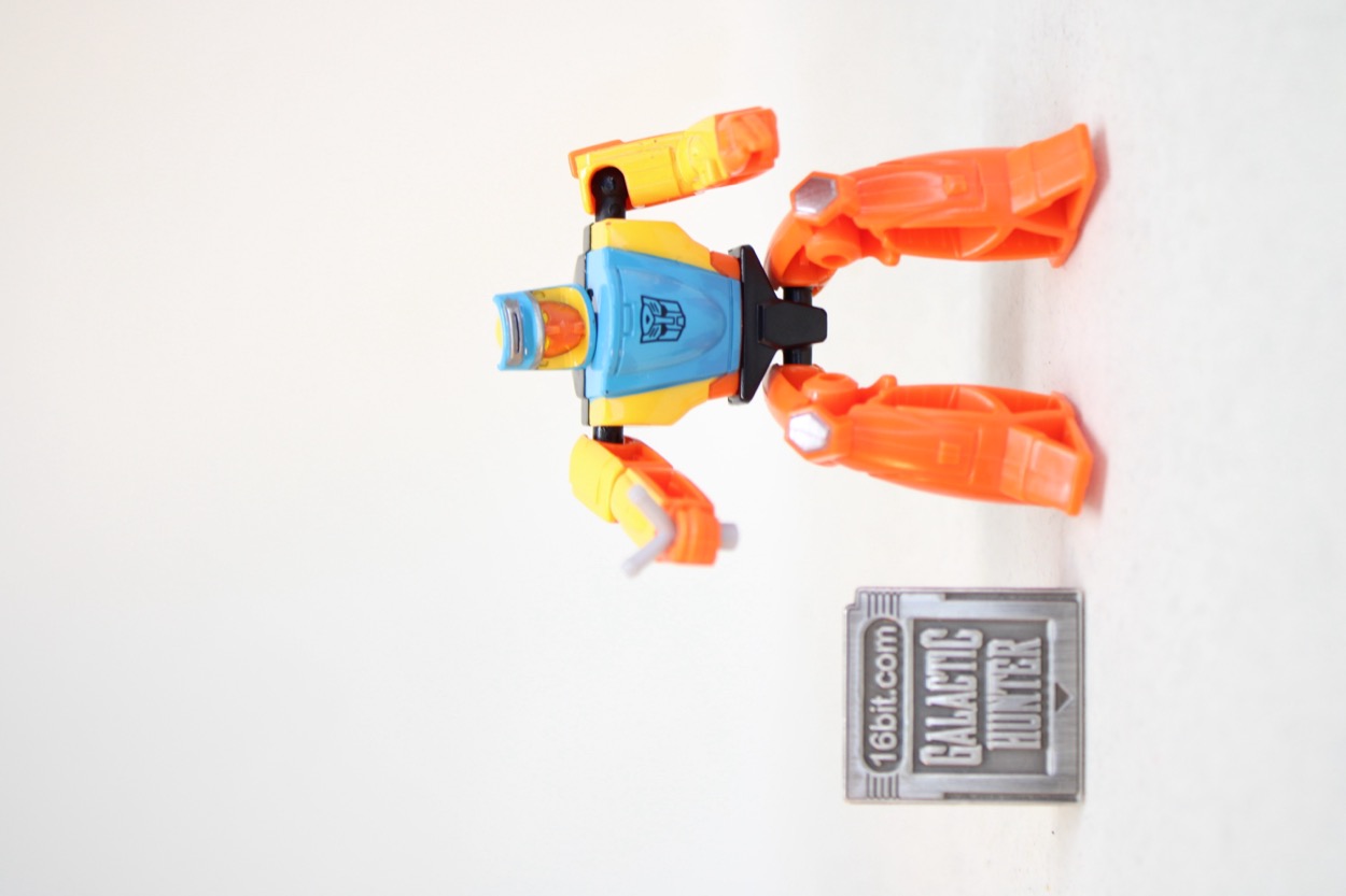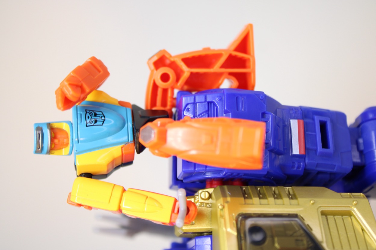 Wheelie's just a little guy, orange like last time but with some changes. G2 never had a proper Wheelie toy in it, so Hasbro took inspiration from the awesome The Story of Wheelie, the Wild Boy of Quintesson. While he doesn't have the sharkticon tooth necklace, he does have the blue "hat" and chest with a really striking outline of an Autobot symbol. He's jointed at the neck, hips, shoulders, and waist but doesn't transform. There's a peg in his thigh which plugs into a hole on Grimlock's shoulder. I wish they just used a transforming mold instead, but I never in a million years thought we'd get "Wild Boy Wheelie" and here we are. Hasbro threw Wheelie out of a couple of releases of this mold, so I'm quite pleased to have this.