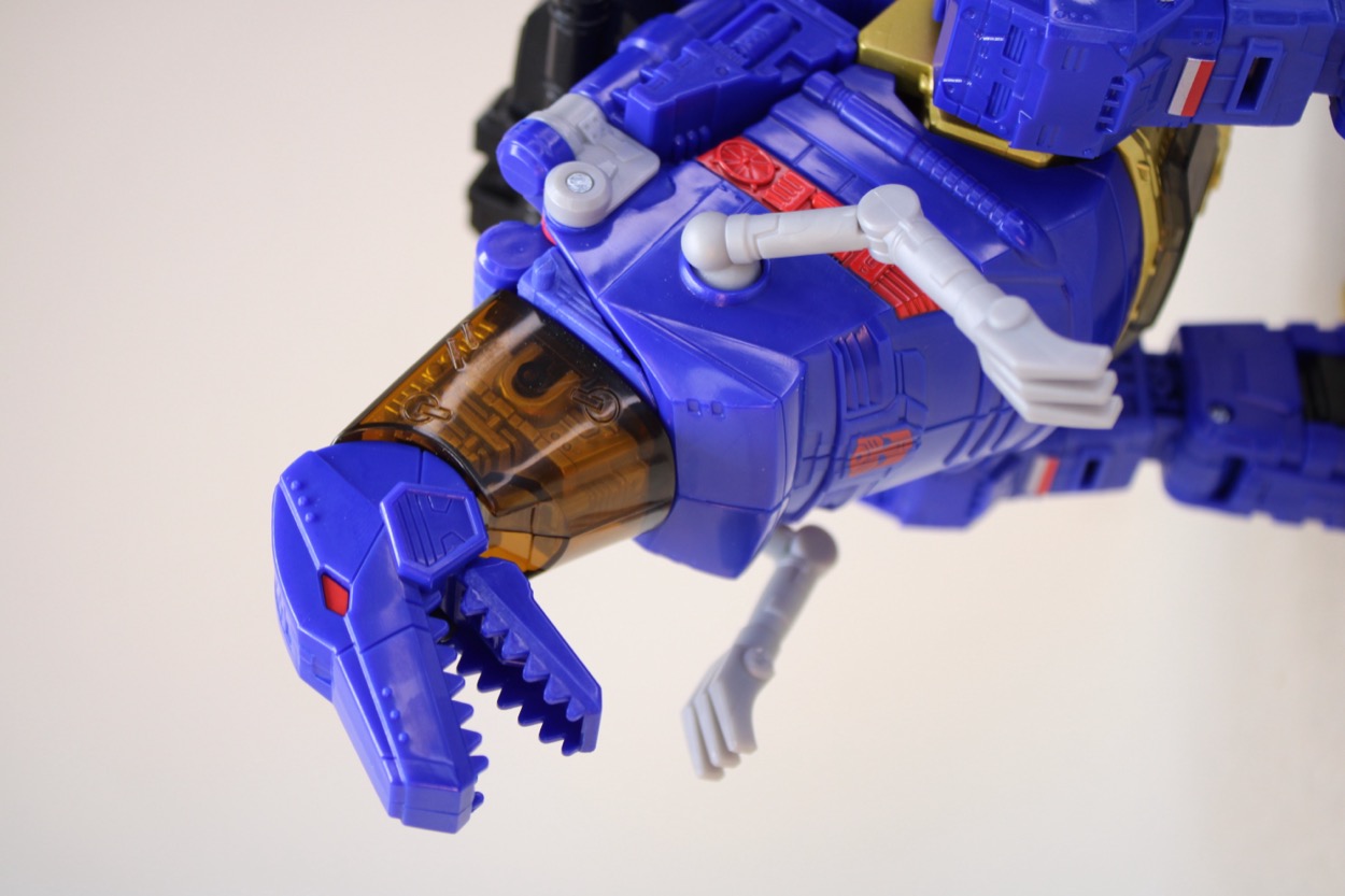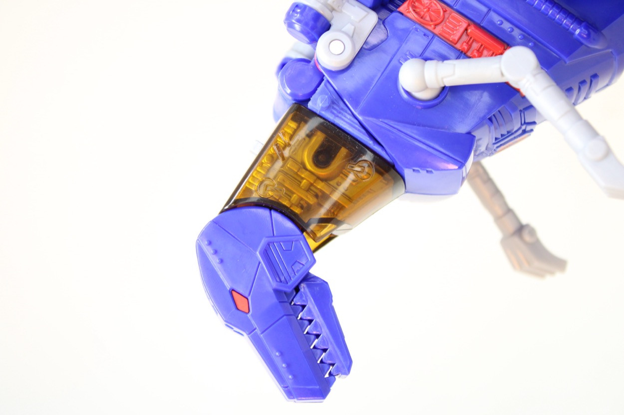 I don't have an original blue G2 Grimlock, but my memory says it looked like this - and it matches pictures fairly well. Robot Grimlock has the clear chest of the original, but almost none of the sticker deco. New bicep paint resembles the silver and red stripes on the original, but the silver on his pelvis? Gone. The blue stripe of the SS86 toy was left off - because of course it was - but they kept the green and red ones. Other leg sticker deco is absent, and the Autobot symbol is still behind a tinted chest that's a little too dark. Hasbro completely excised the vac metal parts, giving you a painted gold chest and claws with gray tail and arm pieces. Is it exactly like the original? No. But you get red eyes, and a vibe that does a good job evoking and old robot you were too cool to buy during the Clinton administration because you were a mature nerd who dunked on Mighty Morphin Power Rangers while buying Playmates Star Trek toys.