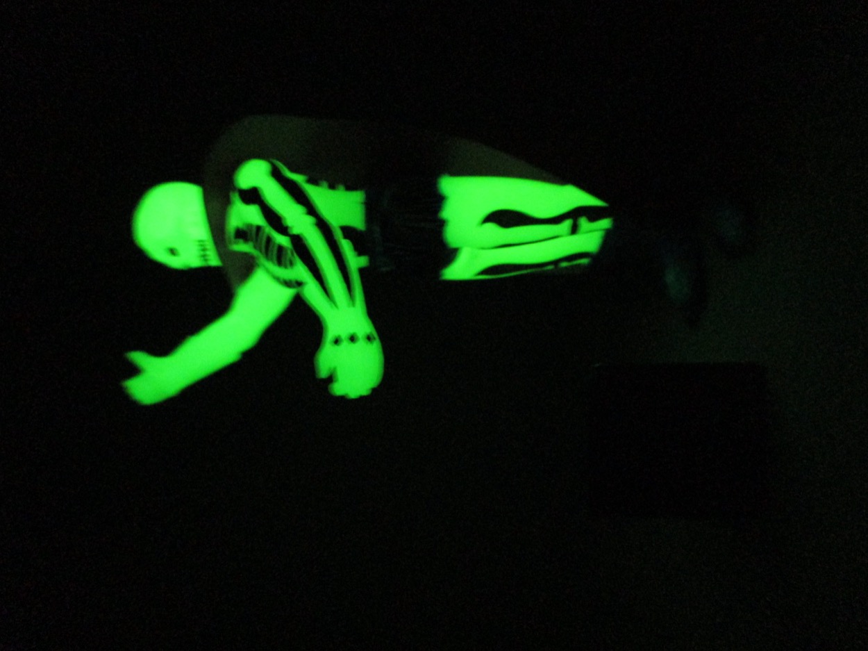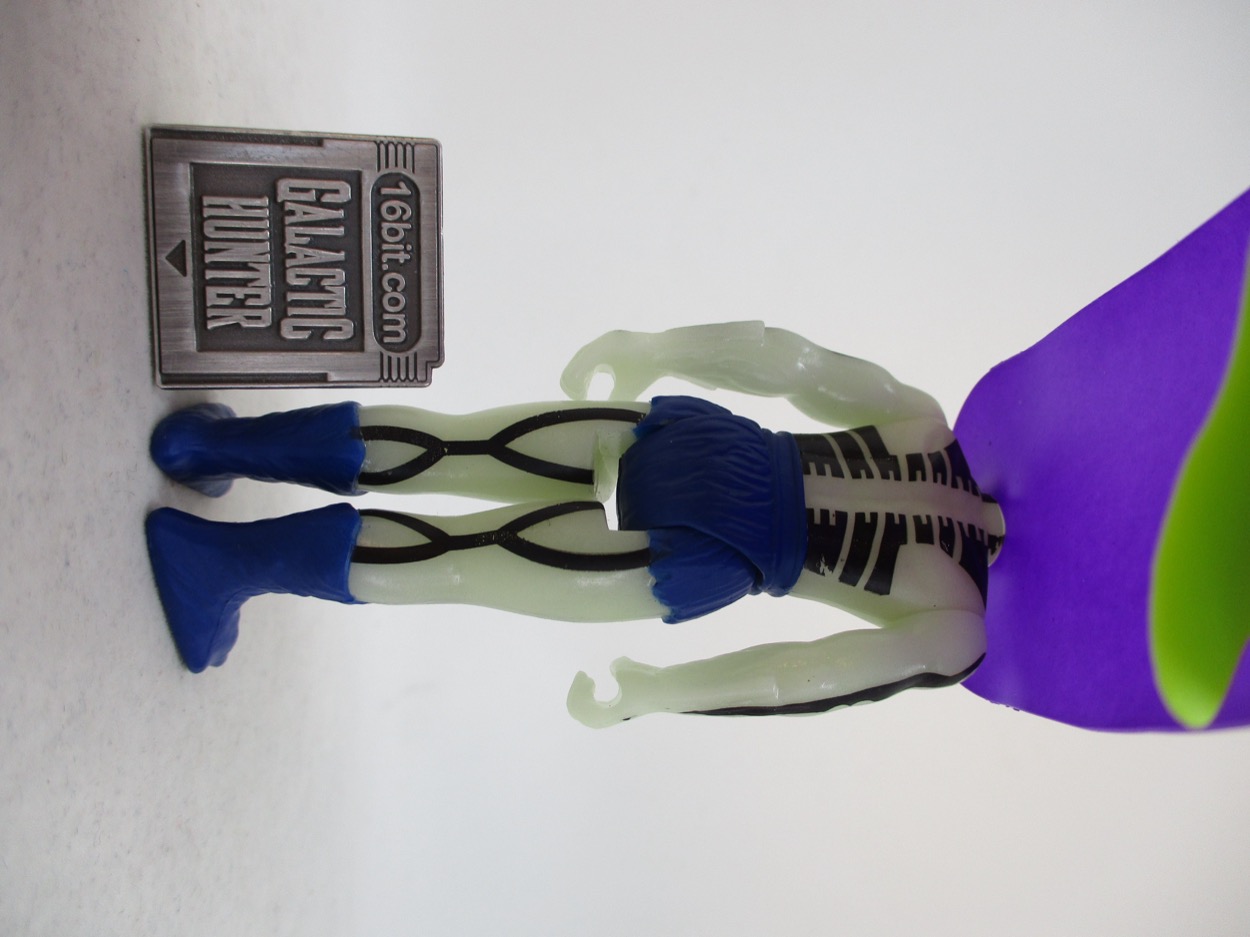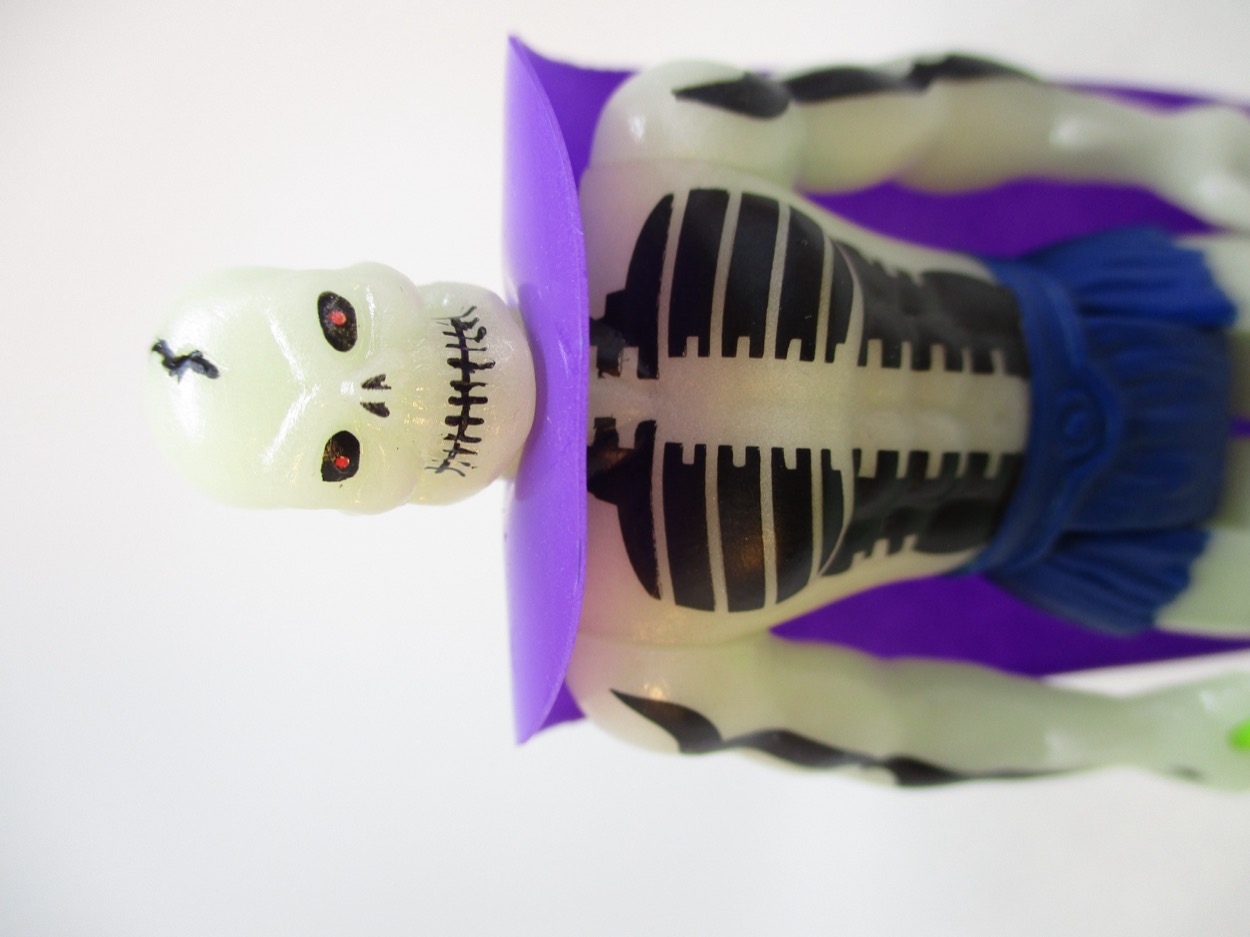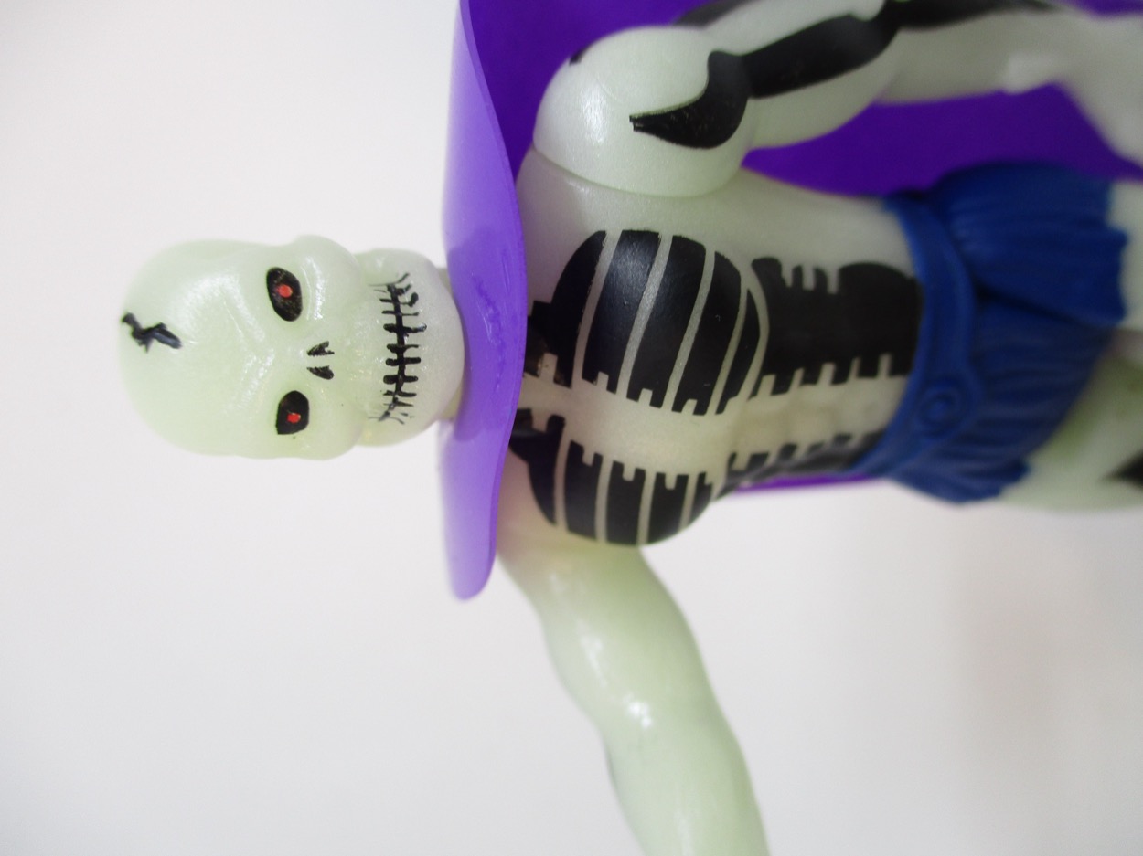 Detail is good - but the glow plastic eats a lot of it up. You can see a ripped torso, and the spiny arm things, plus the fuzzy briefs. The painted detail helps bring him to life a bit, but I don't know if this is something we'd have seen in the 1980s - usually they'd just sculpt a crack in the skull and call it a day. The lines filled in help show the work done on the design,