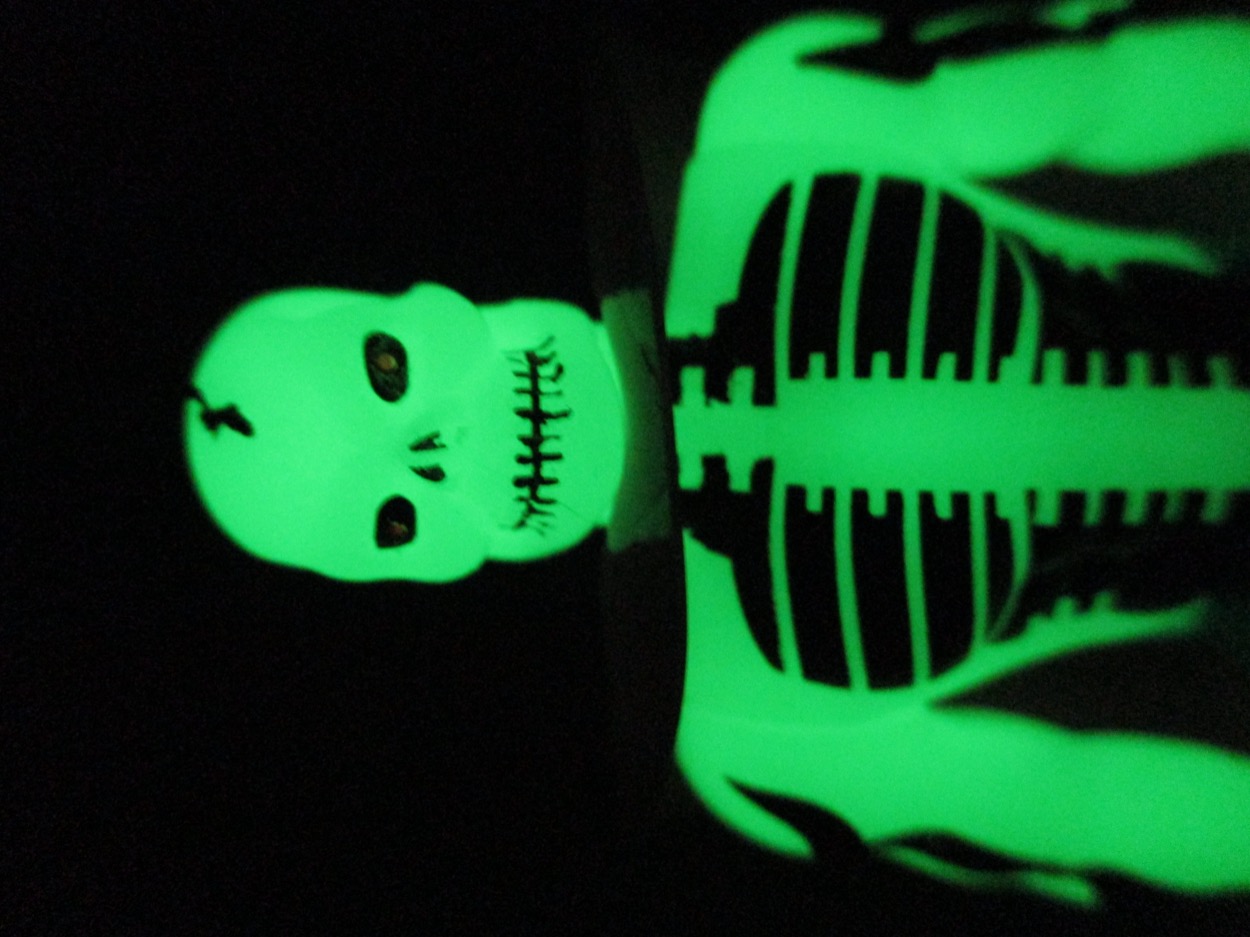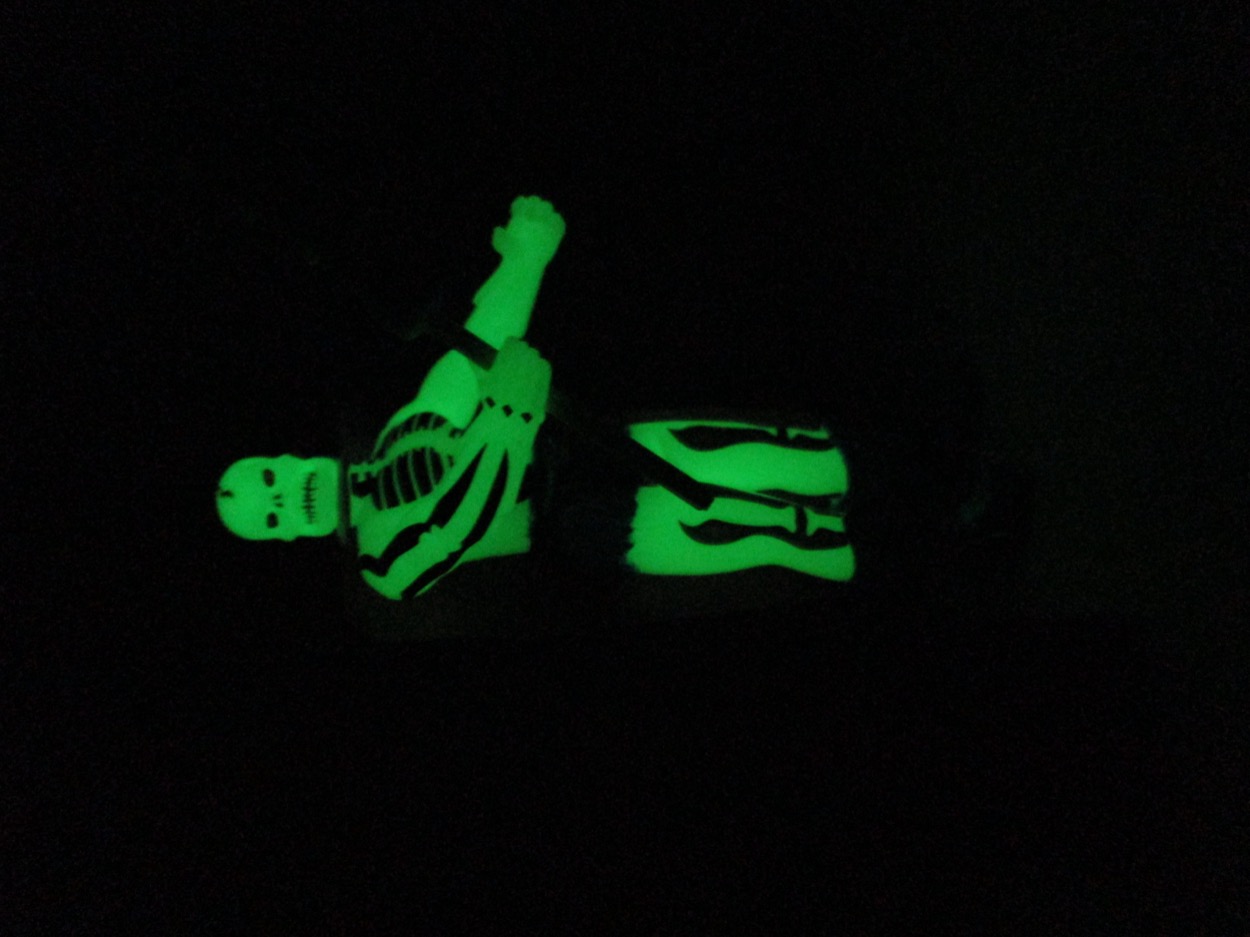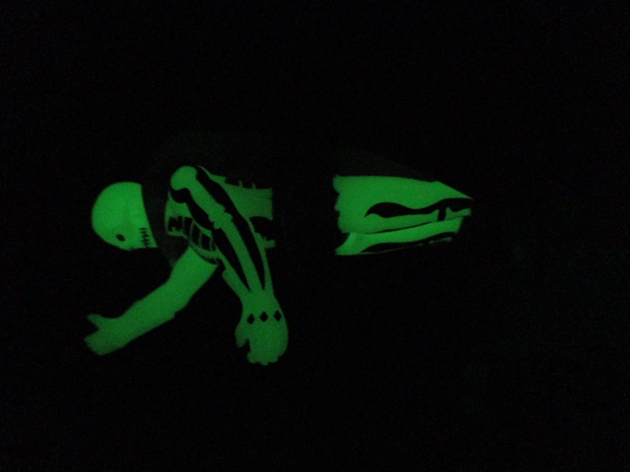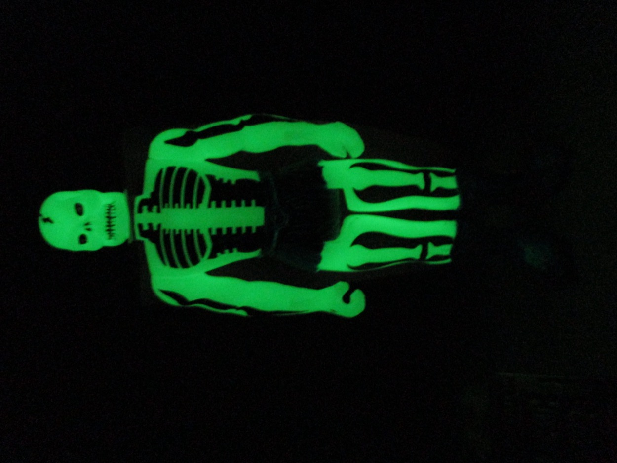 Detail is good - but the glow plastic eats a lot of it up. You can see a ripped torso, and the spiny arm things, plus the fuzzy briefs. The painted detail helps bring him to life a bit, but I don't know if this is something we'd have seen in the 1980s - usually they'd just sculpt a crack in the skull and call it a day. The lines filled in help show the work done on the design,