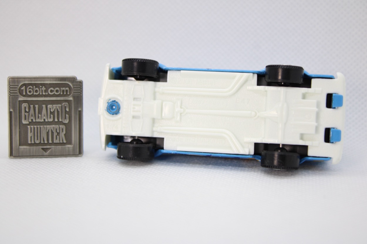 The white plastic base supports a blue painted metal chassis, complete with clear tinted windows. It has a teeny tiny sculpted license plate - sadly painted over in blue, but still impressive - marked TC 4729. I'm now tempted to try to track down other versions of it to see if they're painted, but old Matchbox cars are in very short supply around here. You can get Hot Wheels back to the 1990s all over the place, but people didn't hoard the orange carded competitors quite so much. It's a shame, the detail is pretty much just as good. The Chevrolet logo is sculpted (but not painted) on the front, and there are a lot of indentations for handles.