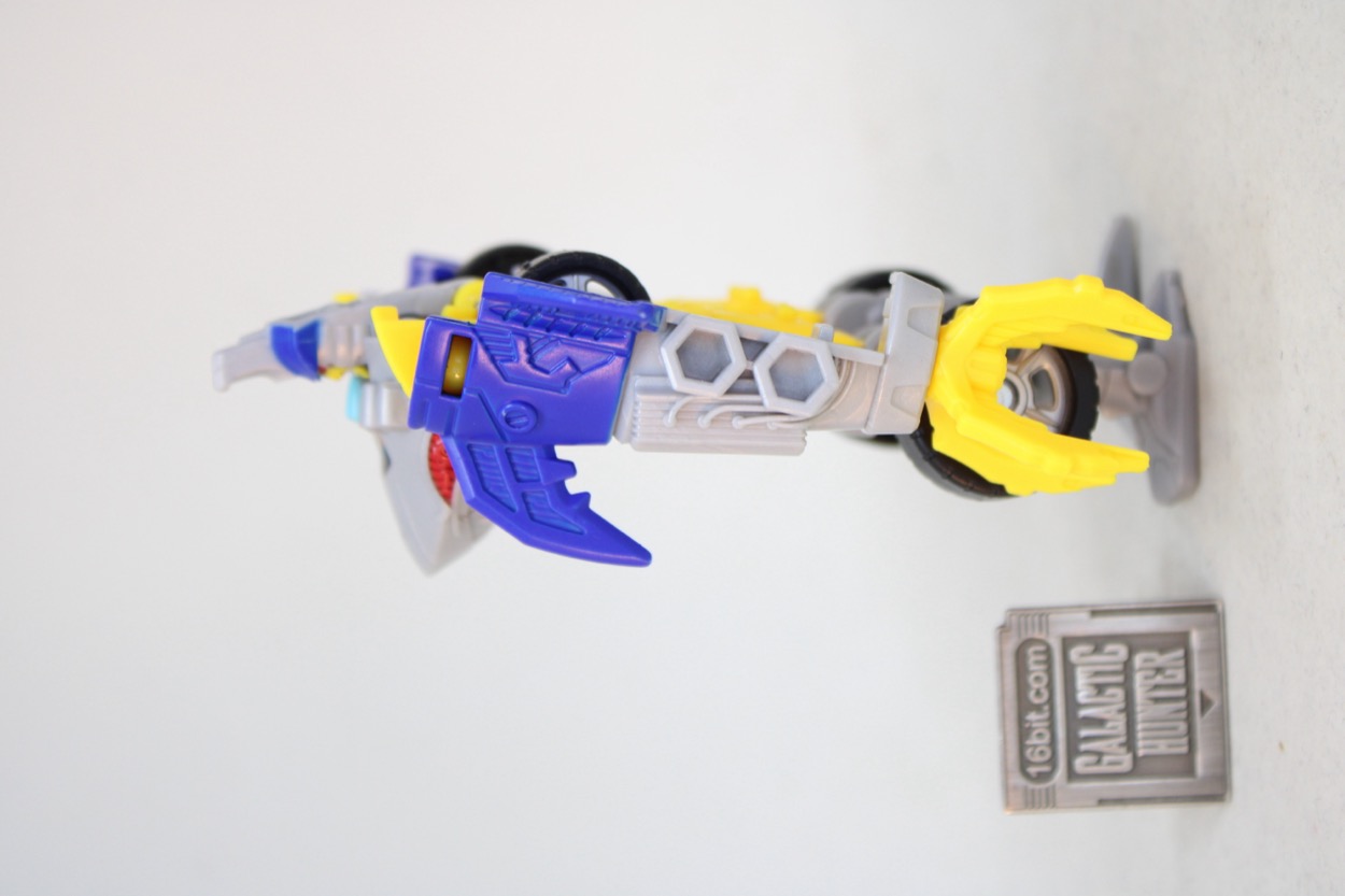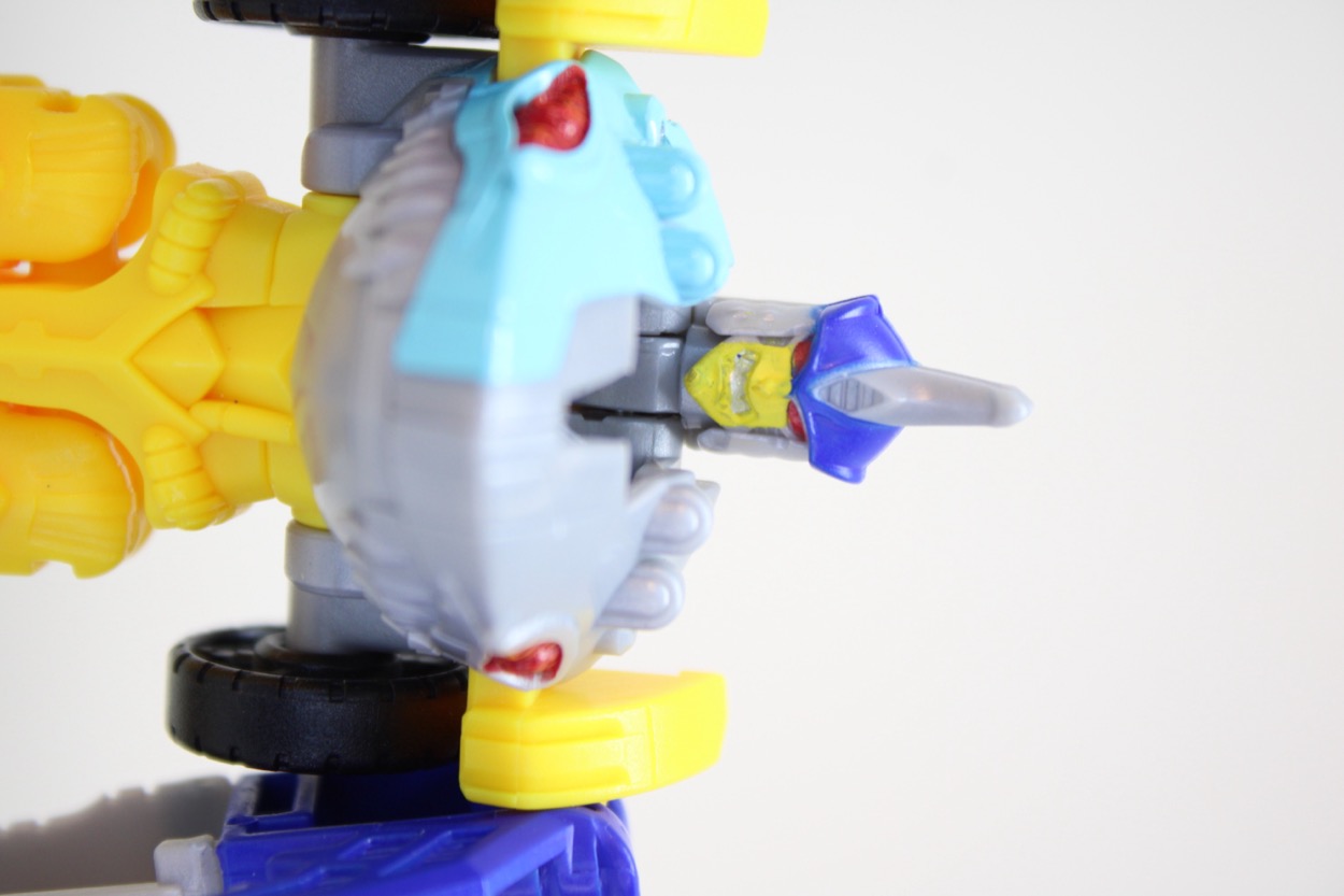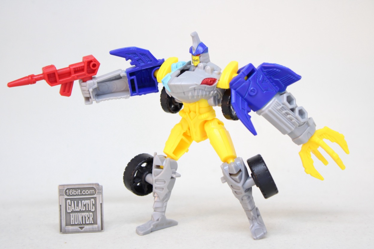 Packaged as a robot - take care to not throw out his claw hand weapon hidden in the tray - he stands about 4-inches high at the fin. The figure has ball joints at the shoulders, hips, and knees making him pretty much on part with a Cyberjet from the 1990s. If the head turned, and the elbows moved, I'd say this would be an A+ kid's toy. As it is, it's still pretty good except the shoulders are stiff enough that it might cause the yellow panels to move out of position. If you hold the shark head when you pose him, though, things aren't really a problem. Despite the limited articulation I was able to get him in numerous battle-ready poses, standing with bent knees or holding other accessories from bigger toys.