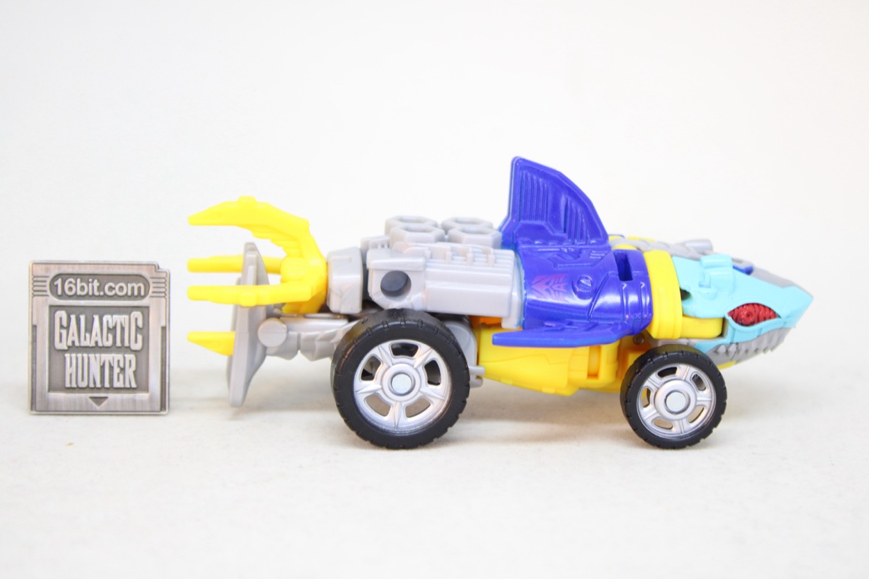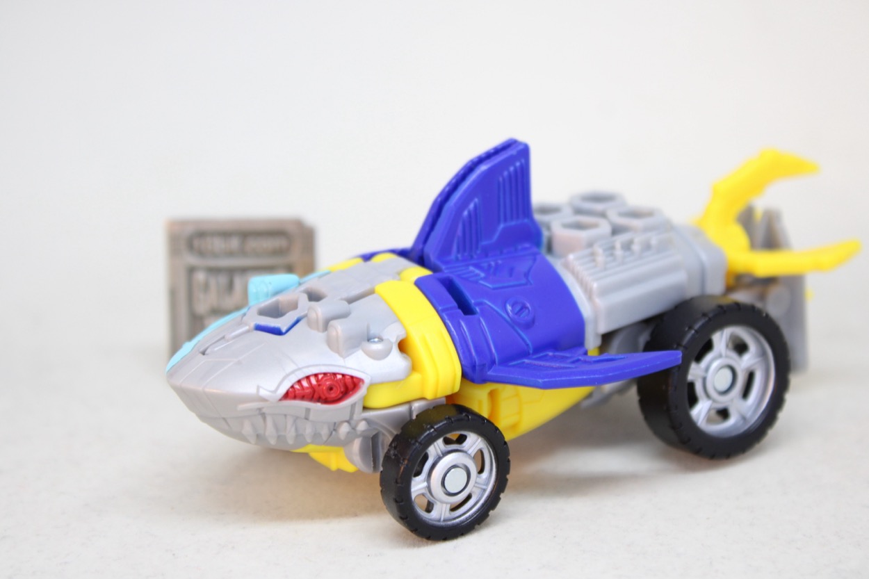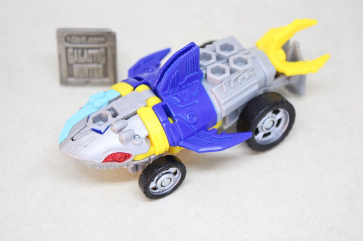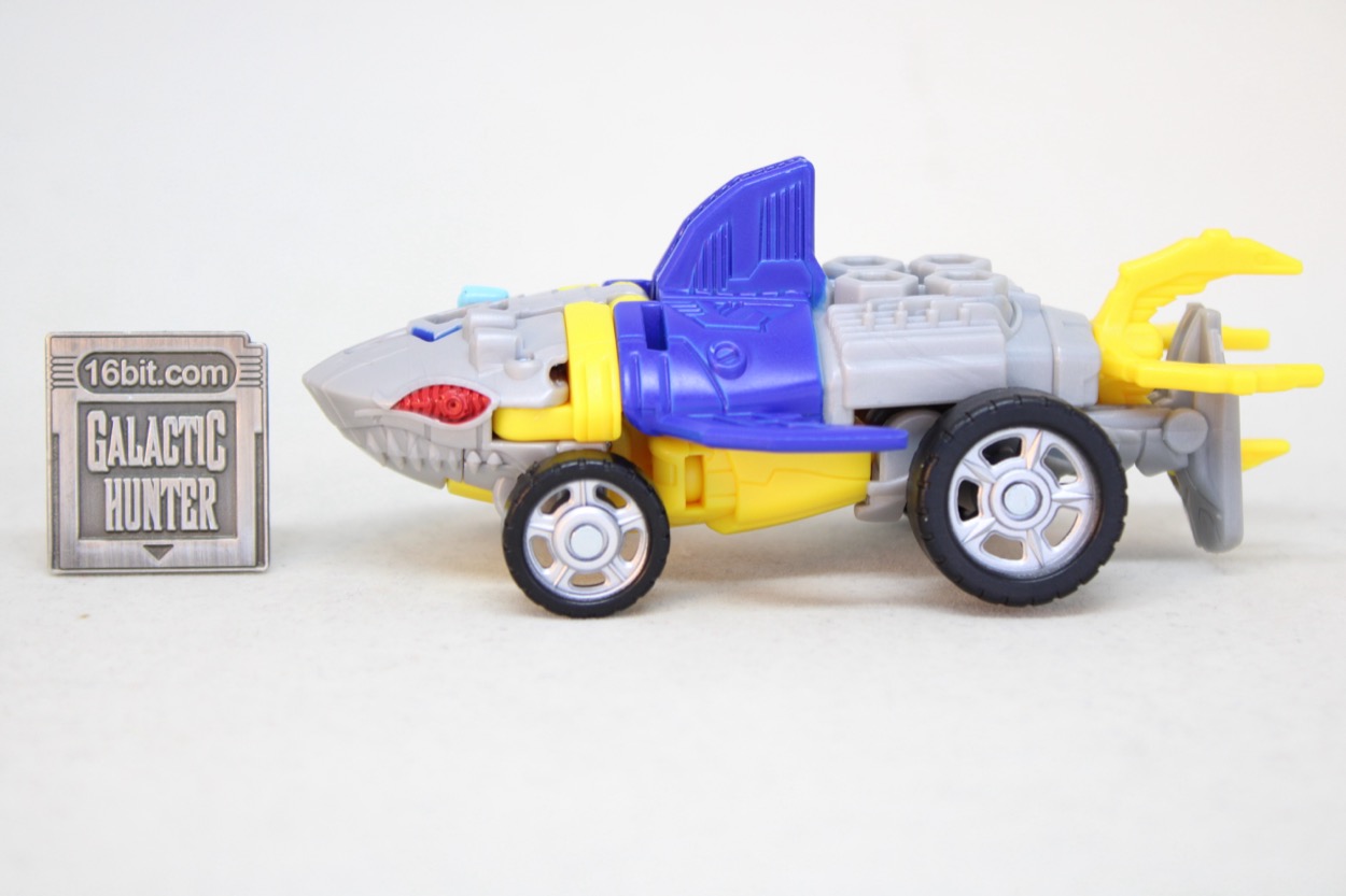 The conversion process is simple and pleasant. I actually flipped him back and forth several times, and it's easy to forget that you don't need to consult a folding road map to make sure a part is in the right spot. Instructions are sandwiched in the backer card, and all you have to do are swing the arms out, put the legs together, and then connect the legs in the arms and presto - wheel shark.