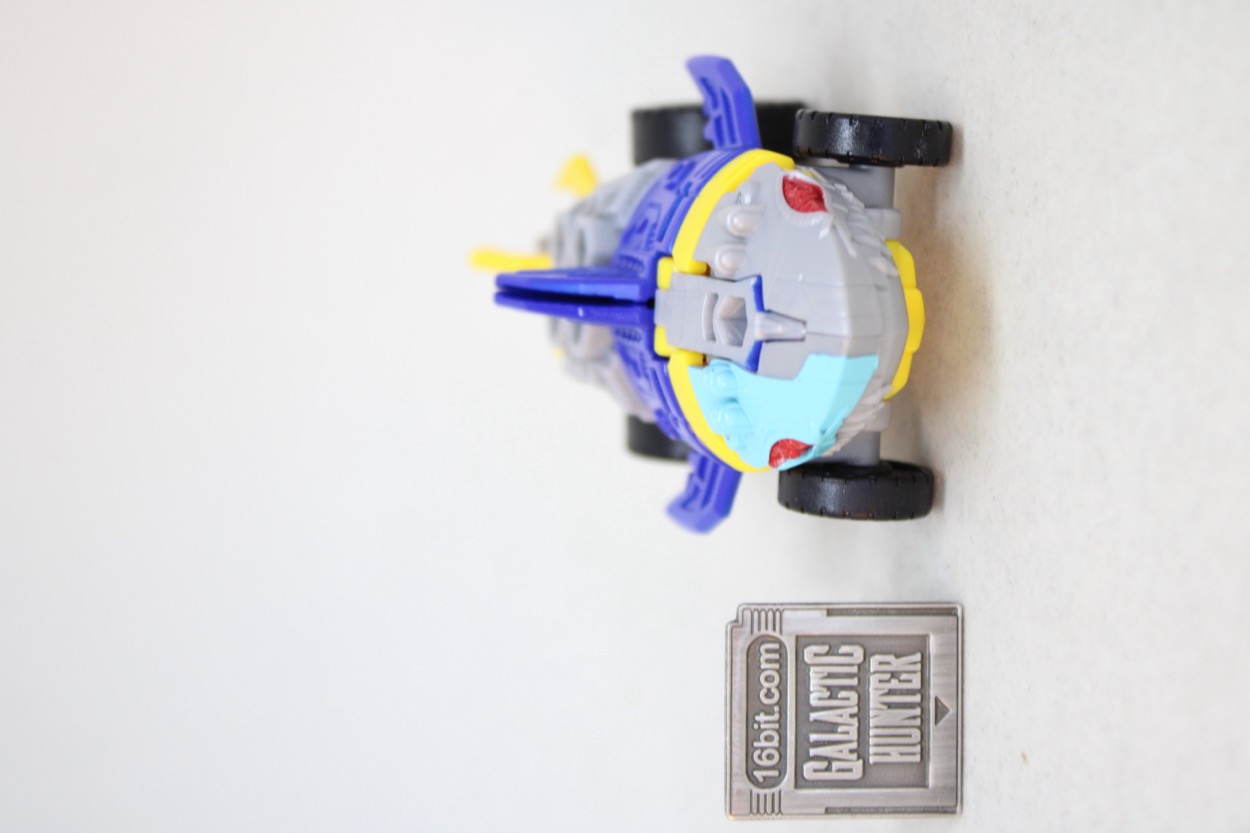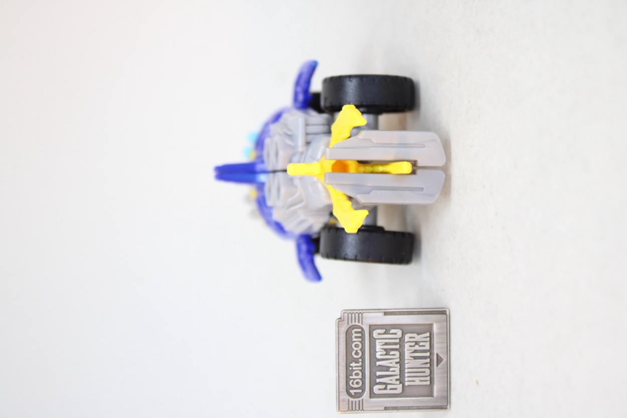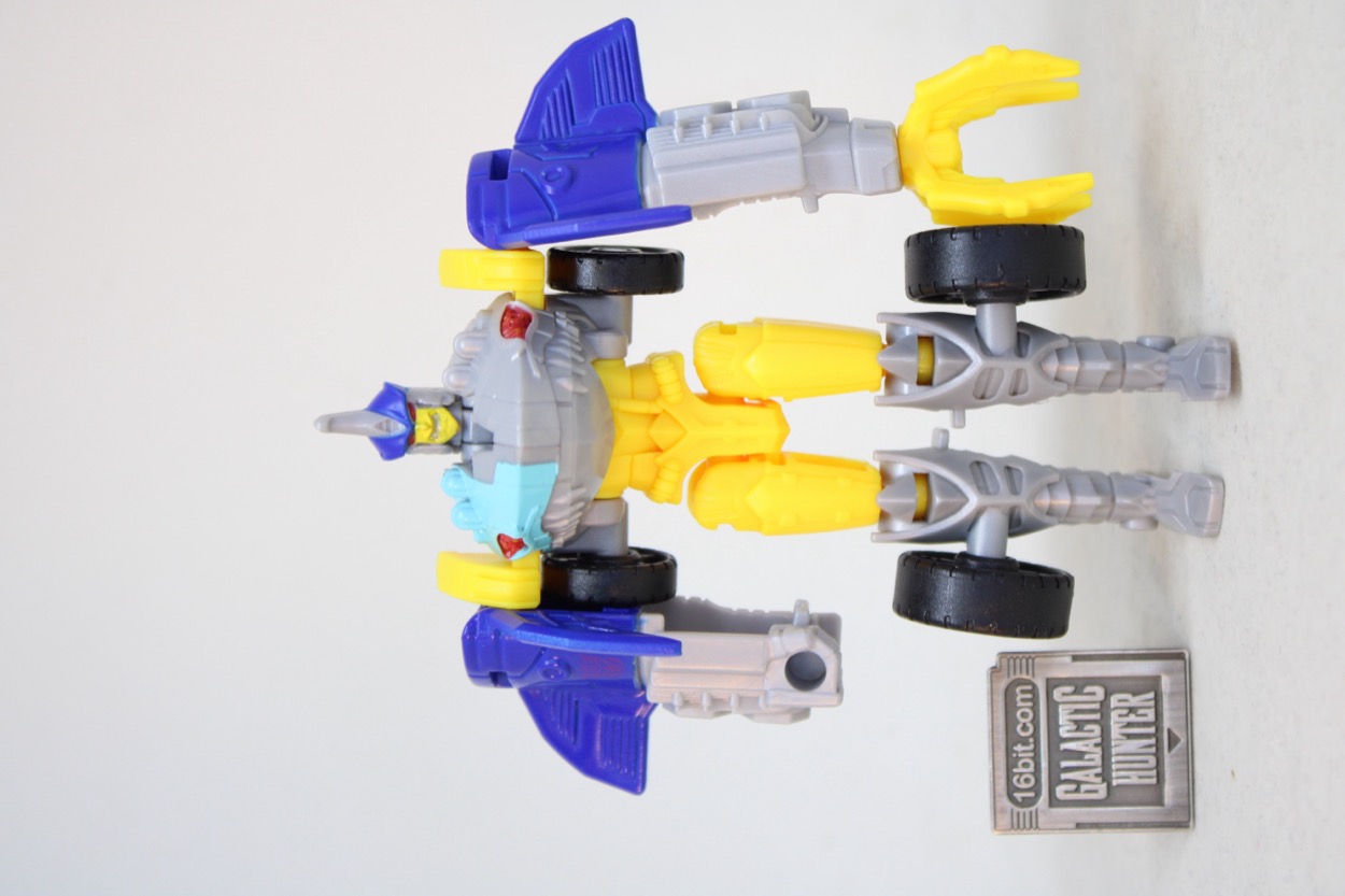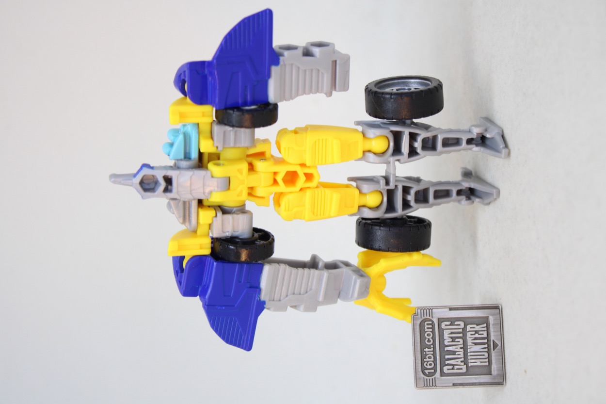 The conversion process is simple and pleasant. I actually flipped him back and forth several times, and it's easy to forget that you don't need to consult a folding road map to make sure a part is in the right spot. Instructions are sandwiched in the backer card, and all you have to do are swing the arms out, put the legs together, and then connect the legs in the arms and presto - wheel shark.