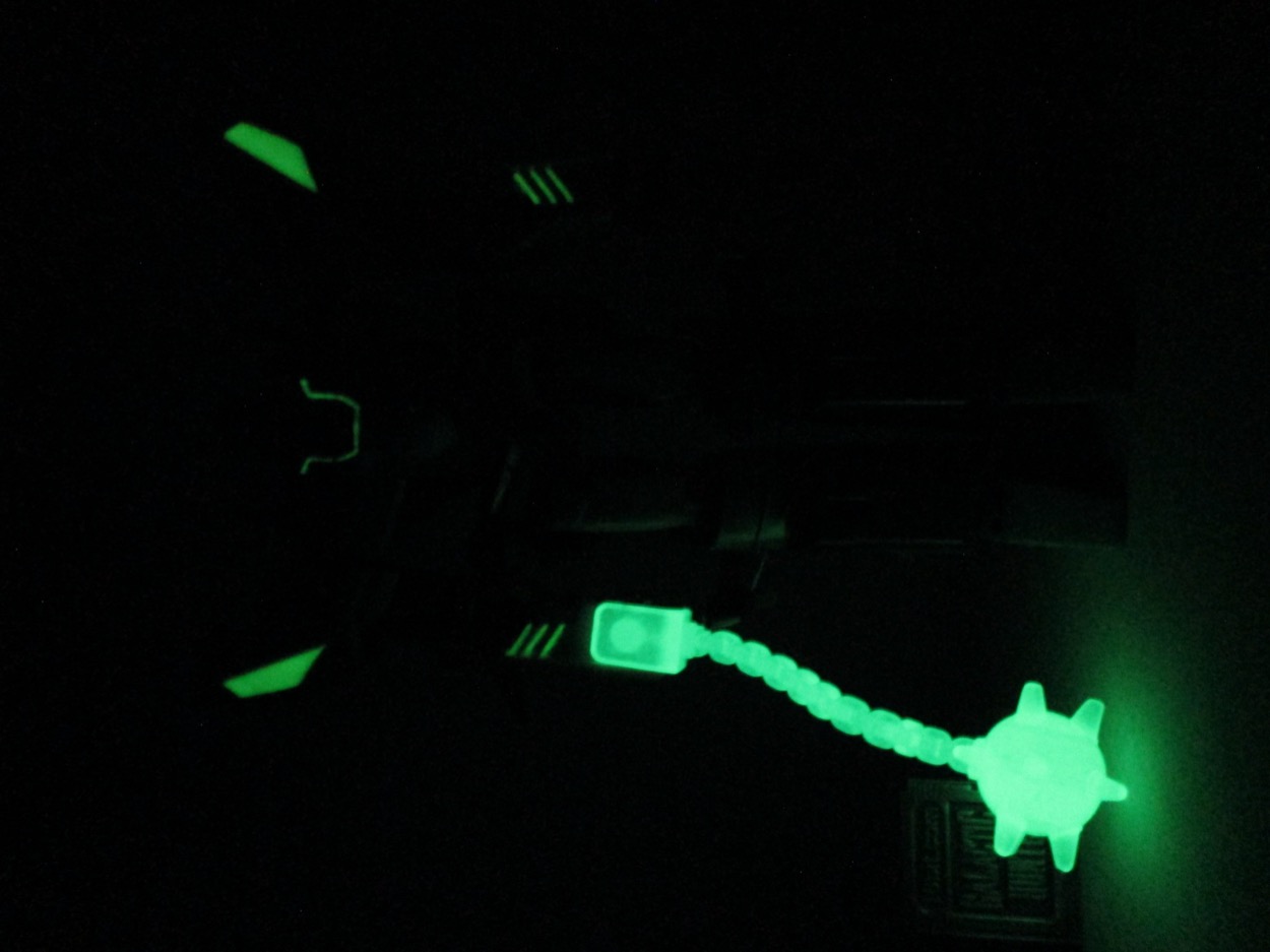 Deco is pretty good. Red on the chest and thighs looks great, and if it were left off I'd not miss it. The fists are painted gray, with the rest of gray parts being primarily molded in color. The blue cockpit and purple Decepticon logo look great, but the reason I bought this figure were the glow-in-the-dark bits. There's a line around his Decepticon sigil, three lines on each forearm, and two big patches on each should painted in very nice glow paint. I wish more things glowed, but everything that does glow does so nicely.