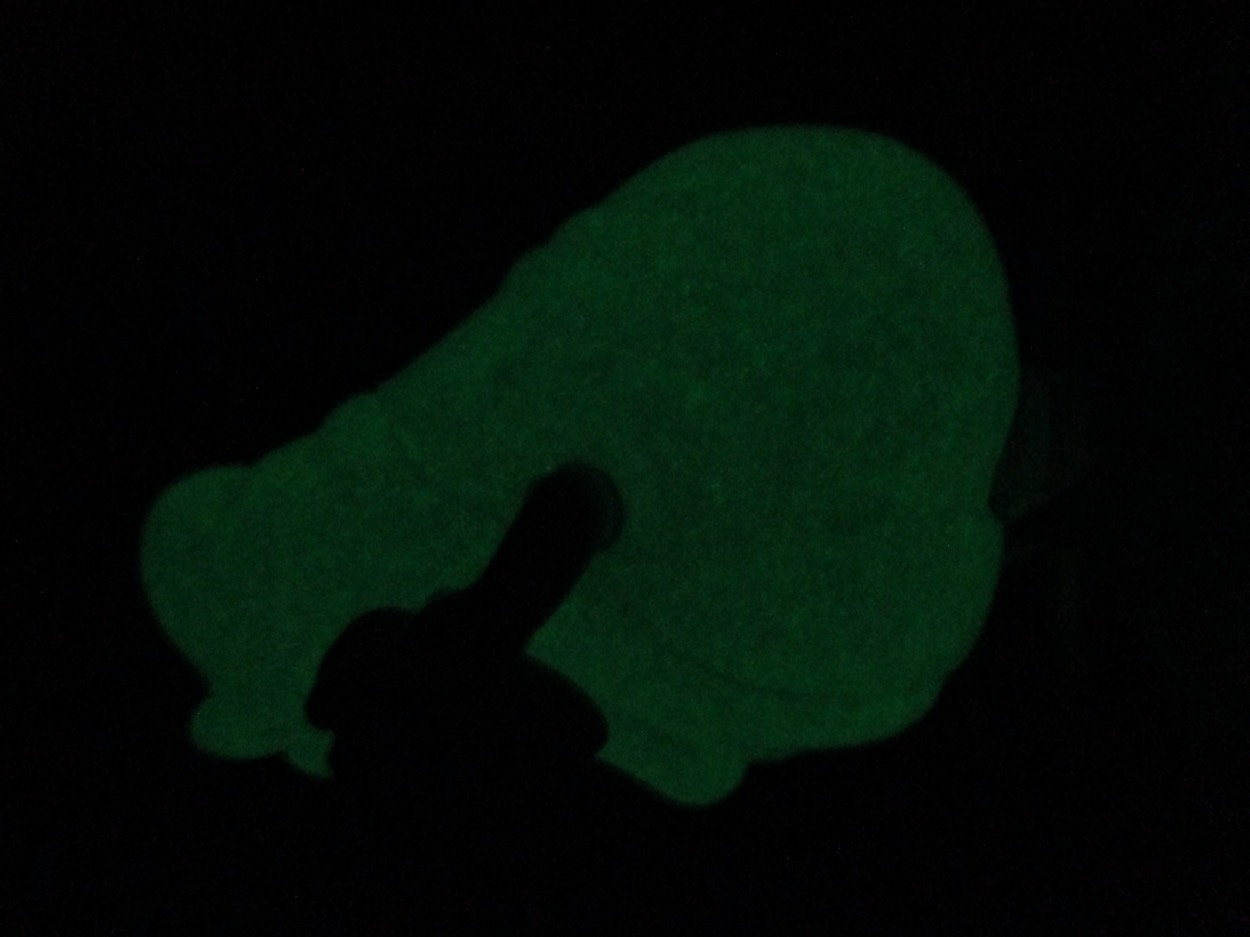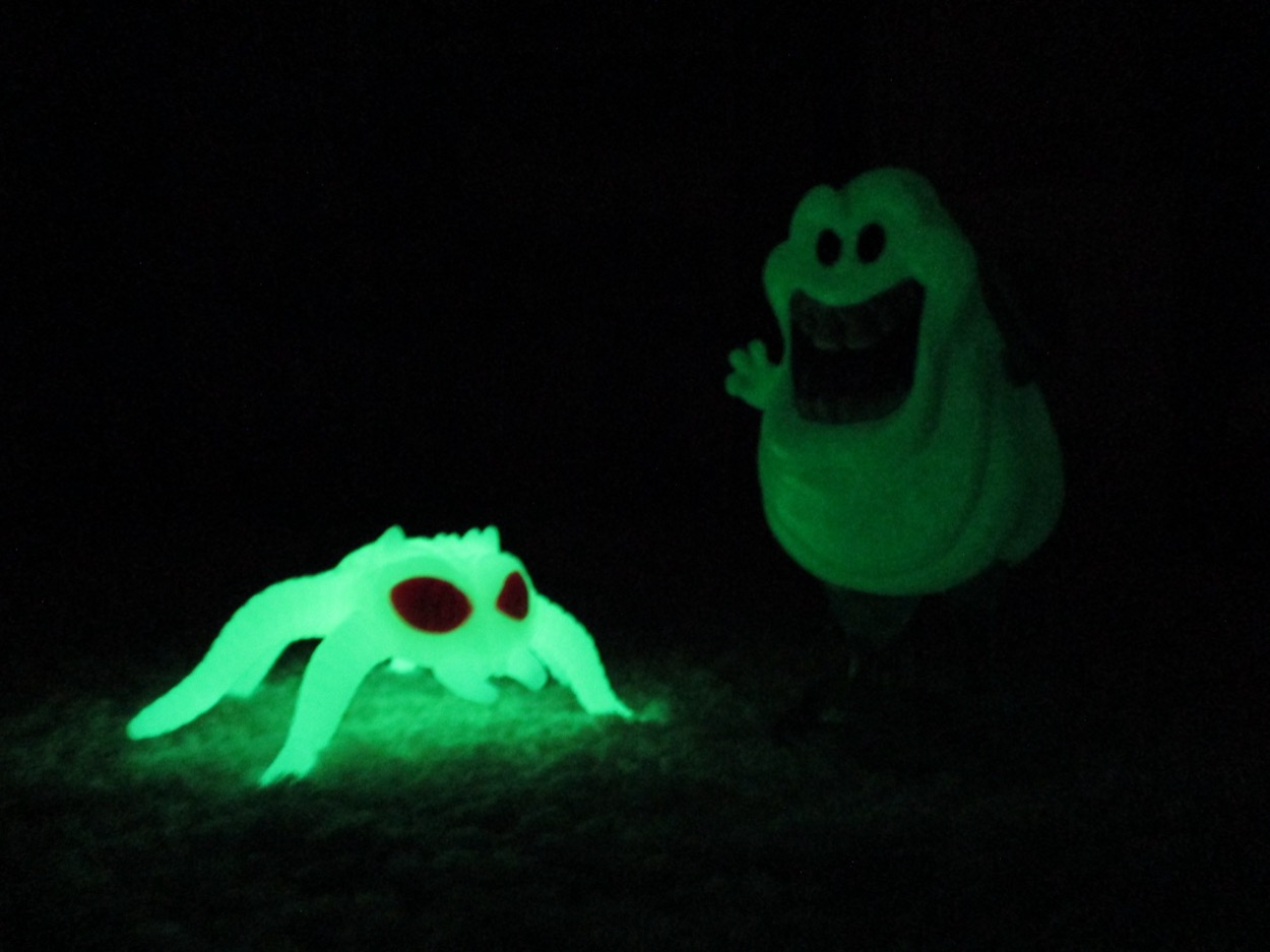 The chase figure and the regular figure look identical - I only photographed the glow one. It's a perfectly good glow color, not quite as bright as I remember him on TV. The eyes are black, the slime is this really nice glossy color. Unfortunately, like the Devo figure, the glow is pretty terrible. When exposed to UV LED, it's pretty weak. When exposed to a CFL bulb it charges OK, but the glow fades so fast it's hard to capture on camera. It needs the Sun to really get much out of it, and even then it's not super bright. The left arm not glowing is probably a fluke on my figure, but it's also just one more thing that would make me say you probably shouldn't bother chasing this one down unless you must have everything that can possibly glow in the dark. Your money is better spent elsewhere. I'm looking forward to seeing how Hasbro's Ecto-Glow "The Green Ghost" turns out in the coming months, as their figures react well to UV and amazingly to the Sun.