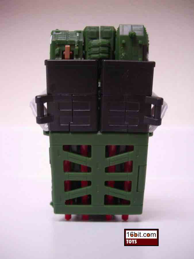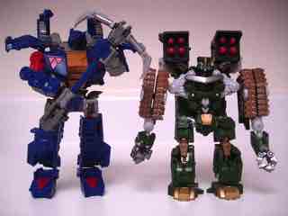 Transformers vehicles generally have little articulation, but this one has four rolling wheels and a missile rack which can rotate or pivot up and down slightly. Due to obstructions from the vehicle, it can turn about 180 degrees and flip up to about 90 degrees. He also has these ugly bars hanging off his racks, and these allow certain weapons included with other toys (specifically Breacher and Darkmount) to be placed on the figure, as seen in the pictures at the top of the gallery below. I suppose it's a nice option-- from 2002 to about 2005, figures had big posts on them to connect Mini-Cons-- but it doesn't really enhance the toy, and these extra weapons are somewhat tough to come by as of now. It seems like a line-wide gimmick that Hasbro isn't really interested in fully supporting with something like, oh I don't know, a name.