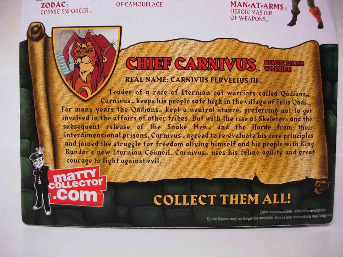 I've been asked by a lot of people why Mattel makes lines with the word "classics" in the name but makes new (or newish) characters like Chief Carnivus who, clearly, is not a classic. Heck, even fans of He-Man may not realize that this lion is the head of a race of feline warriors called "Qadians" from the Mike Young Productions incarnation of He-Man and the Masters of the Universe which aired at some point from 2002-2004. (I watched most of the show and flat-out don't remember ever seeing him.) The character had no analog in the 1980s lines, So that's why you don't know who this is but can name several of the Meteorbs.