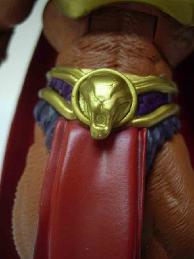 While I can mock the character all day long, I can't knock the quality. Sure, you've got a lion dressed like a combination of a Spartan from 300 and one of the Thundercats, but it's pretty. The bright red pieces of the costume go nicely with the gold, and there are al sorts of great little details all over him. His sword has a red crystal on it, and looks more than a little like Lion-O's Sword of Omens. There is more paint on the sword than most 1980s action figures get, and his shield is similarly stunning with a gold border, purple background, and a red-eyed embossed dragon making up the face of it. The coloring is great, and even the greaves are loaded with deco like little silver gems and purple highlights. Carnivus' claws are all painted too, plus he has painted hair, a lot of fur coloring in his face, and some form of feline or lion on his highly stylized belt buckle.