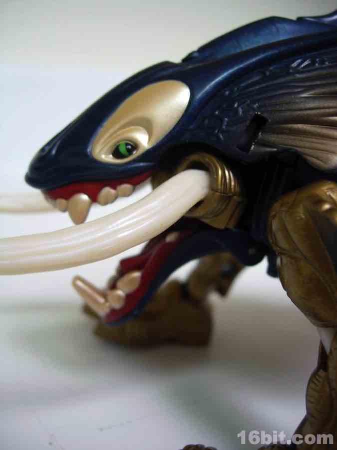 The beast mode is, on the whole, a pretty solid toy on its own. Had Hasbro sold this as a meaner version of its Wuzzles property, little boys might enjoy a vicious, dinosaur-like animal toy. These things could totally fight dinosaurs and don't seem all that out of line with another of Kenner's offerings in 1998, wildly weird hybrid dinosaurs of Jurassic Park: Chaos Effect. In Torca's animal form, he carries a weapon on his back that squirts water-- effectively functioning as a blowhole. His tusks are capable of g.shtmling other figures. Most interesting, though, is that both gimmicks are activated by his dorsal fun-- push forward to squirt, pull back to g.shtml. Simple. The skin textures are pretty great, and there are lots of muscles and veins sculpted on the toy. Even more amazing, the texture of the whale elements are pretty shiny and smooth, creating a nifty contrast. The only thing that could really improve the toy is the color, the gold skin doesn't really read as an elephant, nor does the blue with gold read as an orca, necessarily. It'd have been nice to see a repaint in grey and black, alas, this was not meant to be. In Japan, the toy was decorated in various shades of blue. The legs are all nicely articulated, as is the tail. If you sprang $10 for this creature as a bizarre animal toy, I think many kids would probably enjoy it.