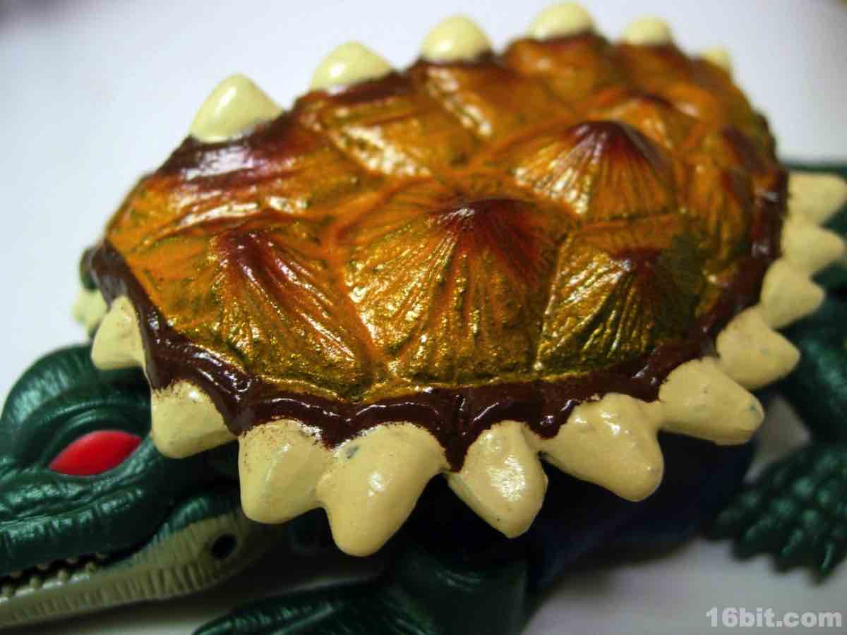 The most amazing thing about the toy-- especially for a 1998 Transformers toy-- is the paint job. The shell is one of the prettiest things I think Hasbro has ever done, and the most amazing thing is that this came out of an era where most toys had, at best, three or four colors of paint on their heads. This shiny finish with the fading browns is really nice, and I can't help but wonder if it was entirely intentional for it to be this rich or if it was just a happy accident in the production process. The previous Beast Wars, turtle, Snapper, had a shell molded in green with some yellow splotches. Terragator has other great details like painted teeth in both modes, big bright eyes, and a creamy color for the bottom of his reptilian head. Sure, that tail gun thing is sort of dorky, but you can't deny that with all the accessories removed that this is a really nice Predacon figure. (There's no escaping beast kibble, folks.)