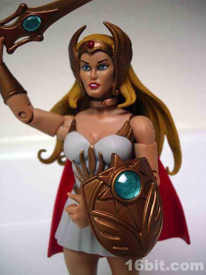 This is Adora, He-Man's twin sister. Fabulous powers were revealed to her, blah blah blah, and now she's She-Ra. "For the Honor of Grayskull!" This action figure was one of the first Masters of the Universe Classics toys to adapt a Princess of Power doll into the action figure format, although some vestigial elements remain. Like her comb axe weapon/hairstyling tool. She-Ra no longer has rooted hair, but should anyone try to attack her while she is doing said hair, she can cut you.