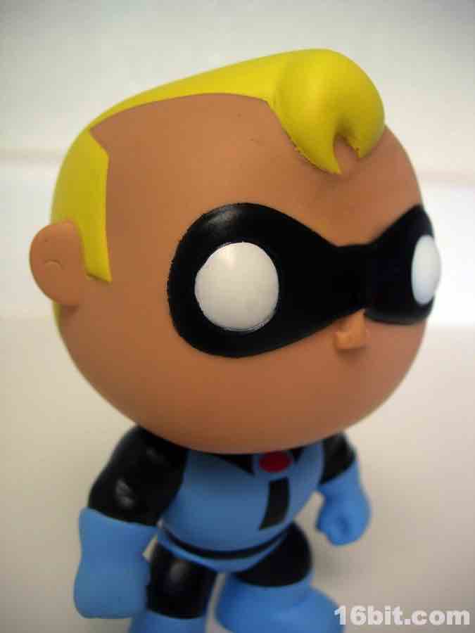 The 4-inch figure has an articulated head and while he lacks the long, strong chin of the movie design he does retain the mask, nose, and "classic" Mr. Incredible outfit in blue and black. The store version should be red and black, consistent with the rest of the family and his own "new" uniform from later in the film. This hobo suit sports the distinctive curl of blonde hair and the big red dot over the "I" on his chest, and he has an exquisitely-sculpted nose. Most figures in this line drop the noses, you'll note that his box art lacks this feature.