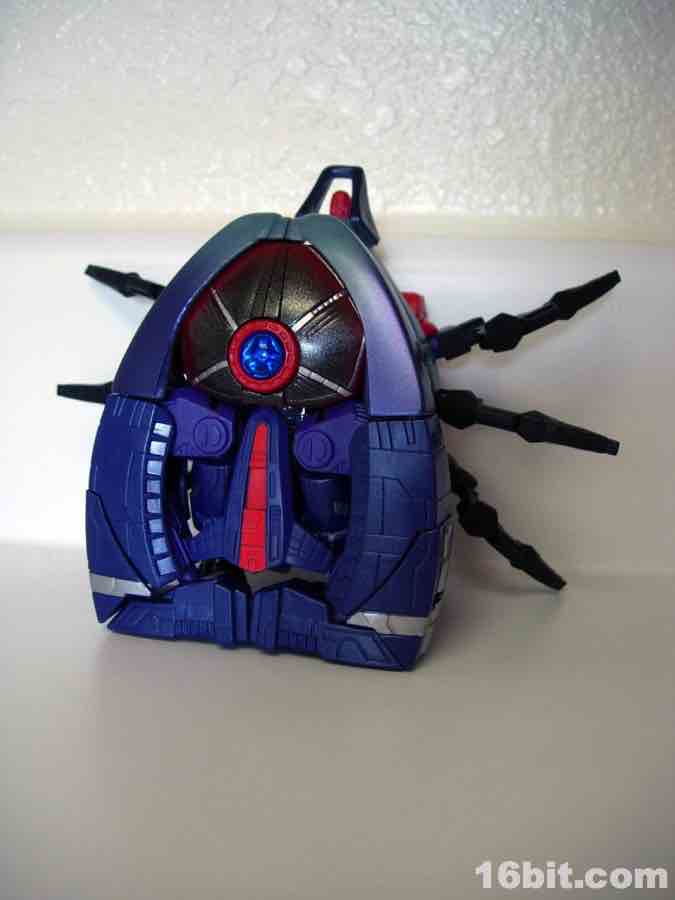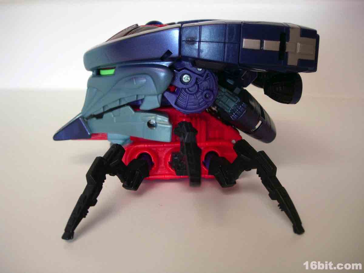 The articulation in robot mode is quite good, and the arms and legs are worth noting for their nifty design incorporating plates and panels without appearing overly kibbly. Little jet engines become heels, and parts of the side of the "giant head" face become armor on his feet. With roughly 15 points of articulation, most of which being in the legs, it's a quality piece. The metallic purple paint, bright red, and pale blue are nicely offset by additional deco details like the gold crest on his head or the Megahead mode's cripplingly bright green eyes. Heck, the robot mode even has sculpted teeth, painted white in a menacing grimace befitting of a crazed robot terrorist which conquered an entire planet and stripped its residents of their bodies. (Beast Machines is, at is core, actually quite grim.)