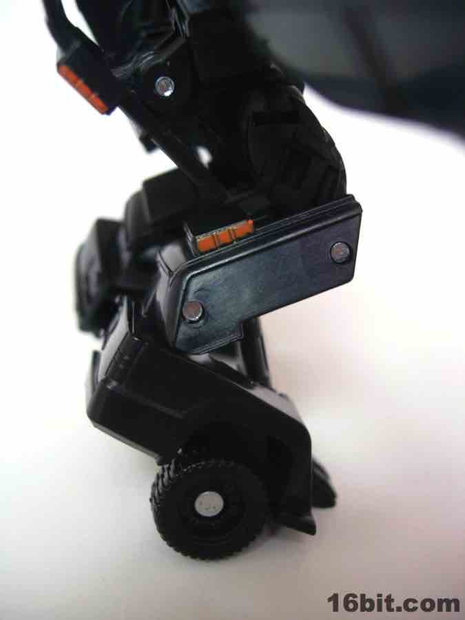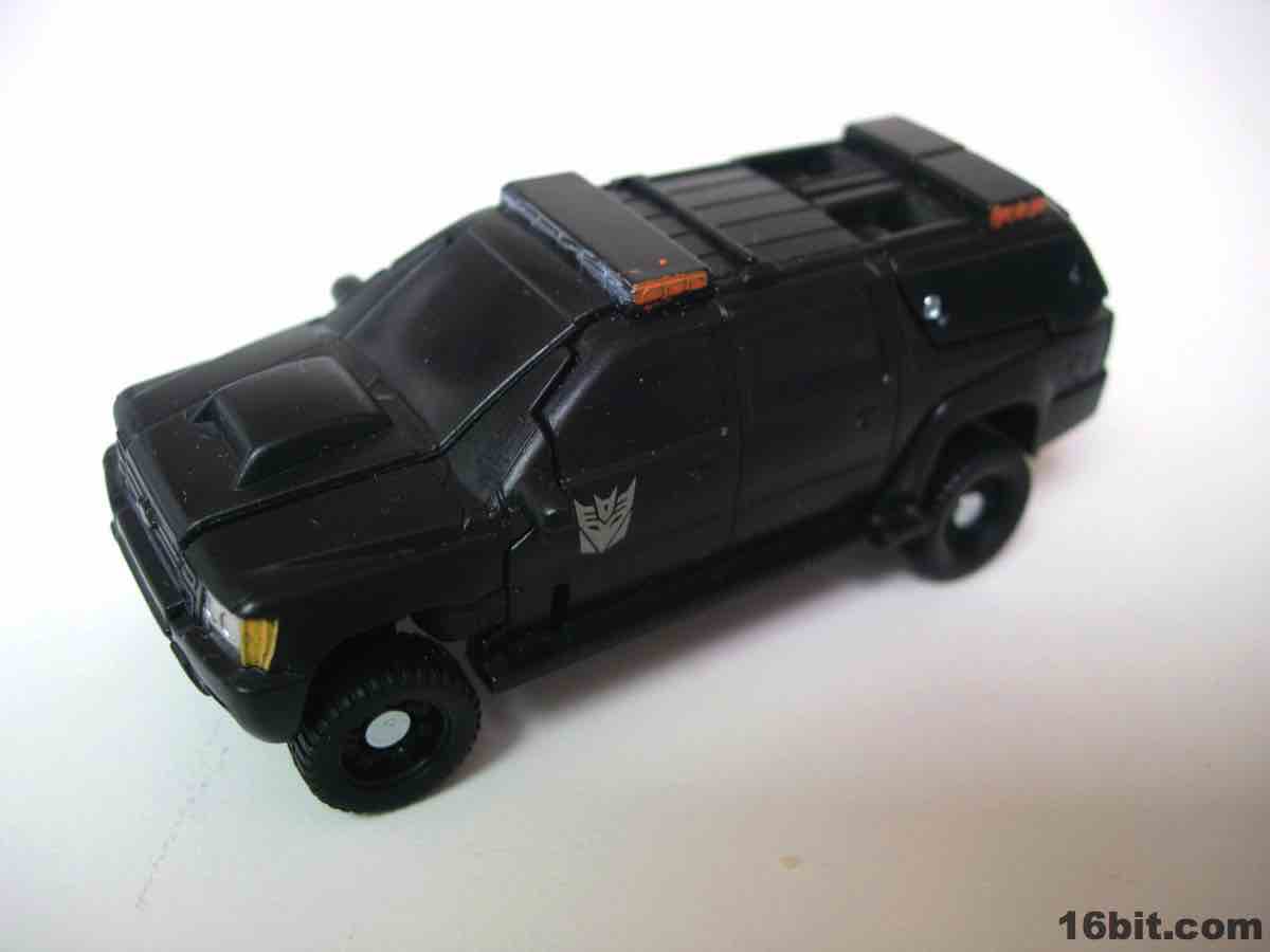 The vehicle is Chevorlet's Suburban, so now you have an evil spy robot in his own nondescript black van. Really, that's about perfect. The paint detail is a little weak-- the orangey lights on the roof on the sides is pretty sloppy-- but there are headlights, a Decepticon symbol, and even little yellow lights where the turn signals presumably are. It's a nice car, nothing supremely cool or weird unfortunately, so I wouldn't suggest picking this one up just because the Chevy Suburban is some amazing piece of automotive engineering. The toy is pretty solid, the wheels roll freely and nicely, and this is one of the better toys in this scale I've played with as of late. For $5, it seems a smidgen small, but that's true of the entire line. If you have a few bucks burning a hole in your pocket and love small toys, this is a worthwhile purchase. (The deluxe-class toy, though, is only twice as expensive at retail and is significantly more impressive.)