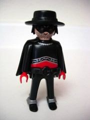 Playmobil Now there's a cool figure for the cunning El Zorro, go fetch his sword, his horse! This is another example of the surprisingly international-- and arguably archaic-- entry in Playmobil's line. The hero had a huge place in popular culture in the 20th century, although I'm not sure there's an "and beyond" here. As far as I can tell, this is the first Zorro that Playmobil put out and it's not explicitly labeled "Zorro" anywhere on the packaging. According to some recent cases, the character should be in the public domain since the 1919, although there is a company claiming ownership of the character. So it's not too surprising Playmobil wouldn't go out of their way to brand this as Zorro, but for the sake of this column, it's Zorro. That's what people are going to call it on eBay, after all.