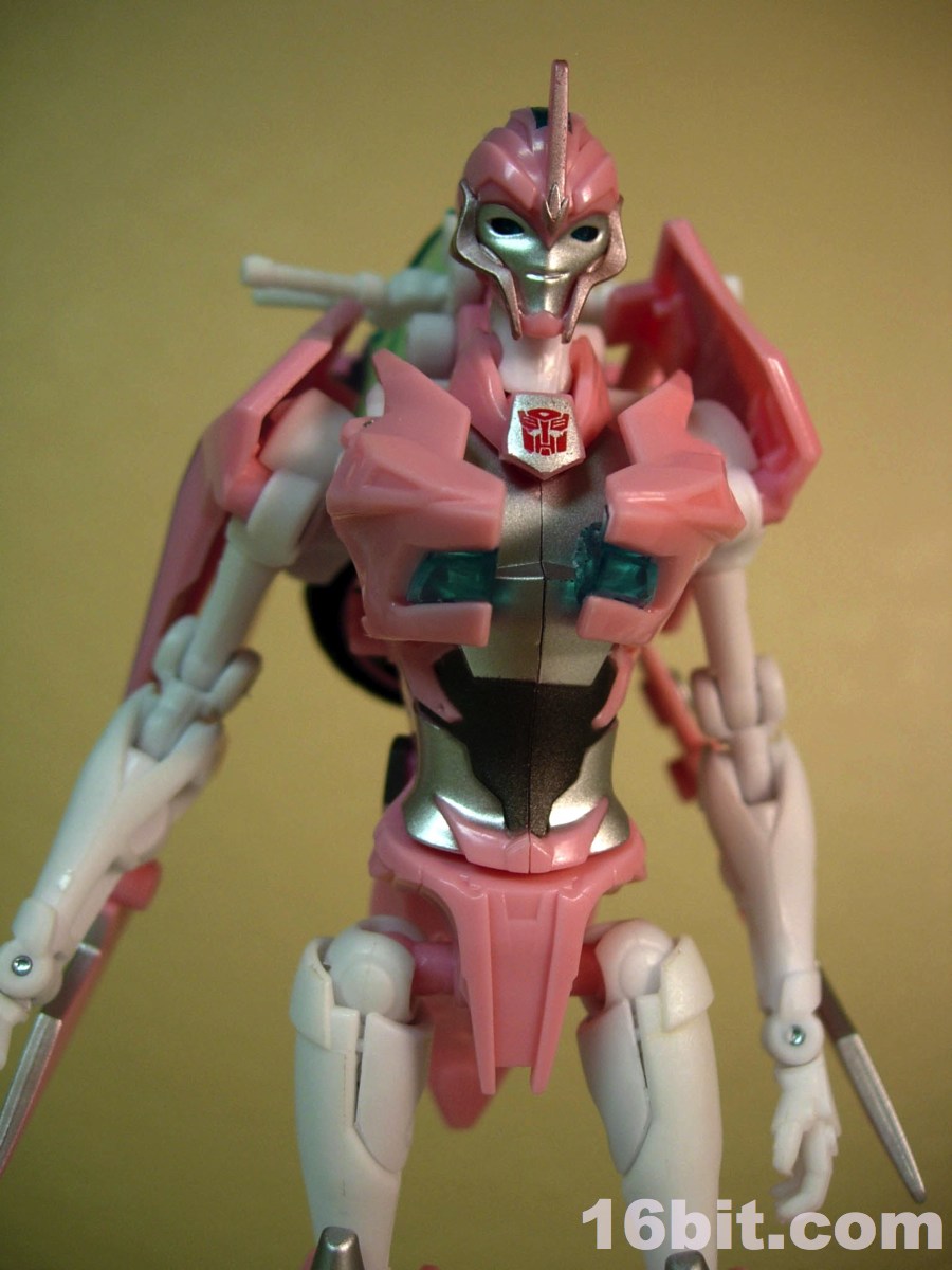 I don't know why, but Hasbro seems intent on delaying Transformers Prime at retail shelves-- at least they've been nice enough to trickle out a few prepaints of figures like Arcee so you can enjoy something before the line launches properly! The pink Autobot is actually blue on the TV show, but pink-- girly pink-- scratches a G1 itch and will no doubt delight most of the adult fans who wished she were pink in the first place. The blue version just came out days ago, but this came out first and is therefore awesomer.