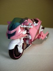 In vehicle mode, she's a bike. There's a kickstand which doesn't add much support, as her blade weapons tend to provide most of her stability. Balance is an issue due to the shape of the tires, but again, she was designed to lean. The pink bike is a throwback to several previous Arcees, meaning those who were hoping for or expecting a "classic" version are going to be left wanting for at least another year or two at this rate. The wheels spin nicely, and it almost feels like a figure could be able to ride her-- but Hasbro opted not to go that route for this one. (Hey, it worked for Kicker!)