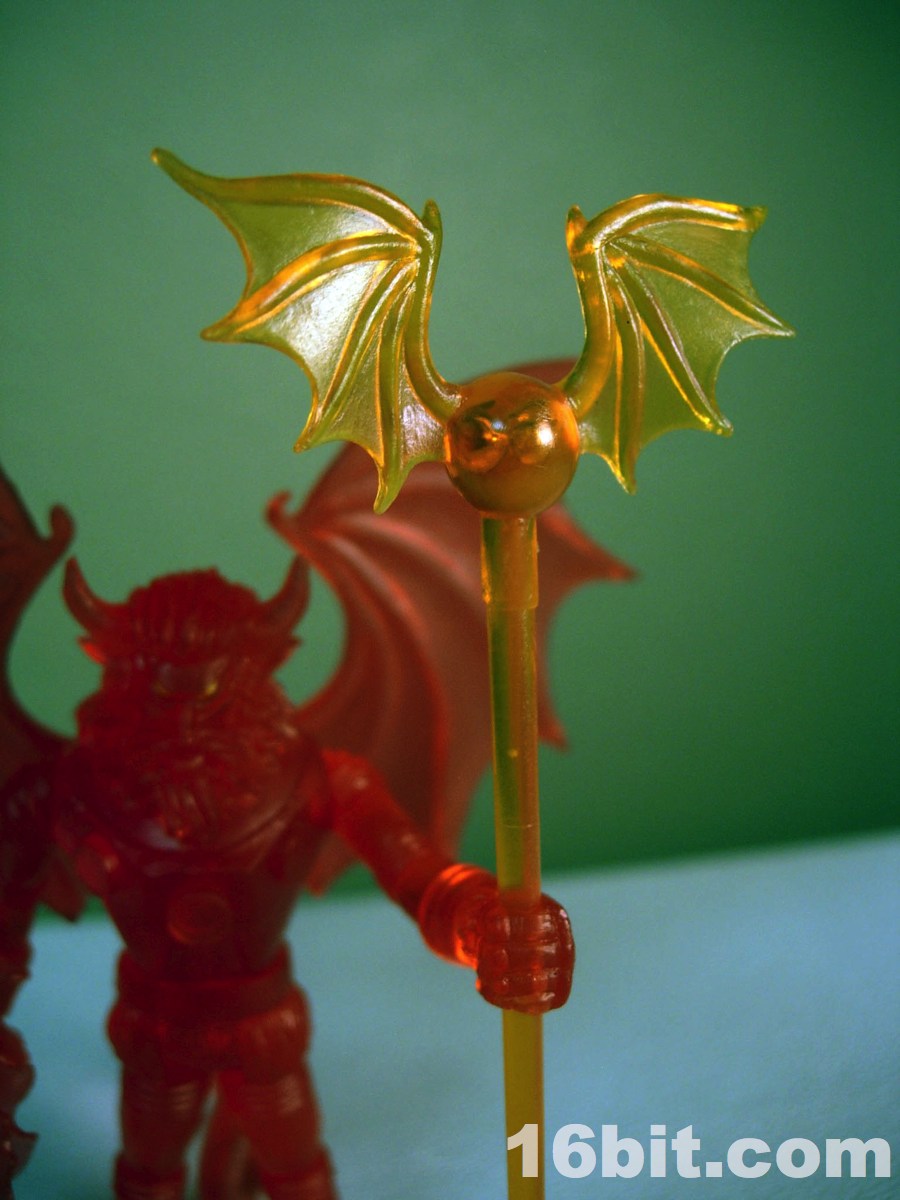 The gargoyle gun is back, as is the winged orb staff, both of which are neat and would be neater if painted. The 2-piece helmet is cast in clear orange ABS plastic, and pops off fairly easily if you want it to-- but mine hugs the head nicely, so that's a plus. The figure is cast in red, with yellow eyes painted to give him a menacing, yet Micronauts-esque visage.