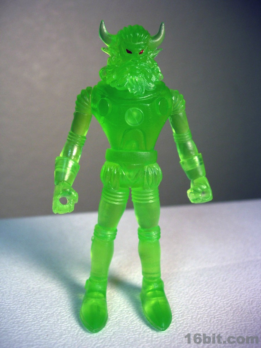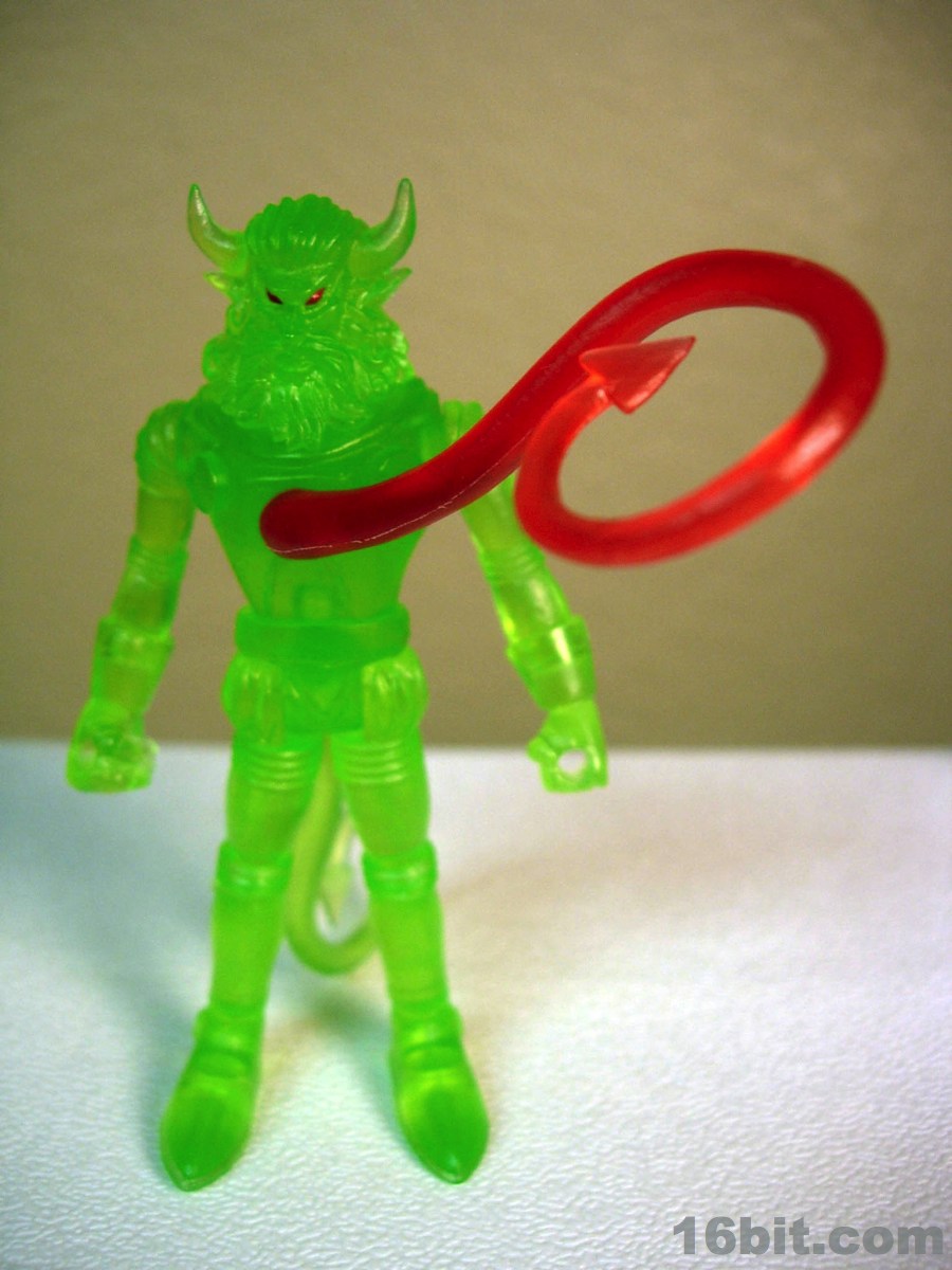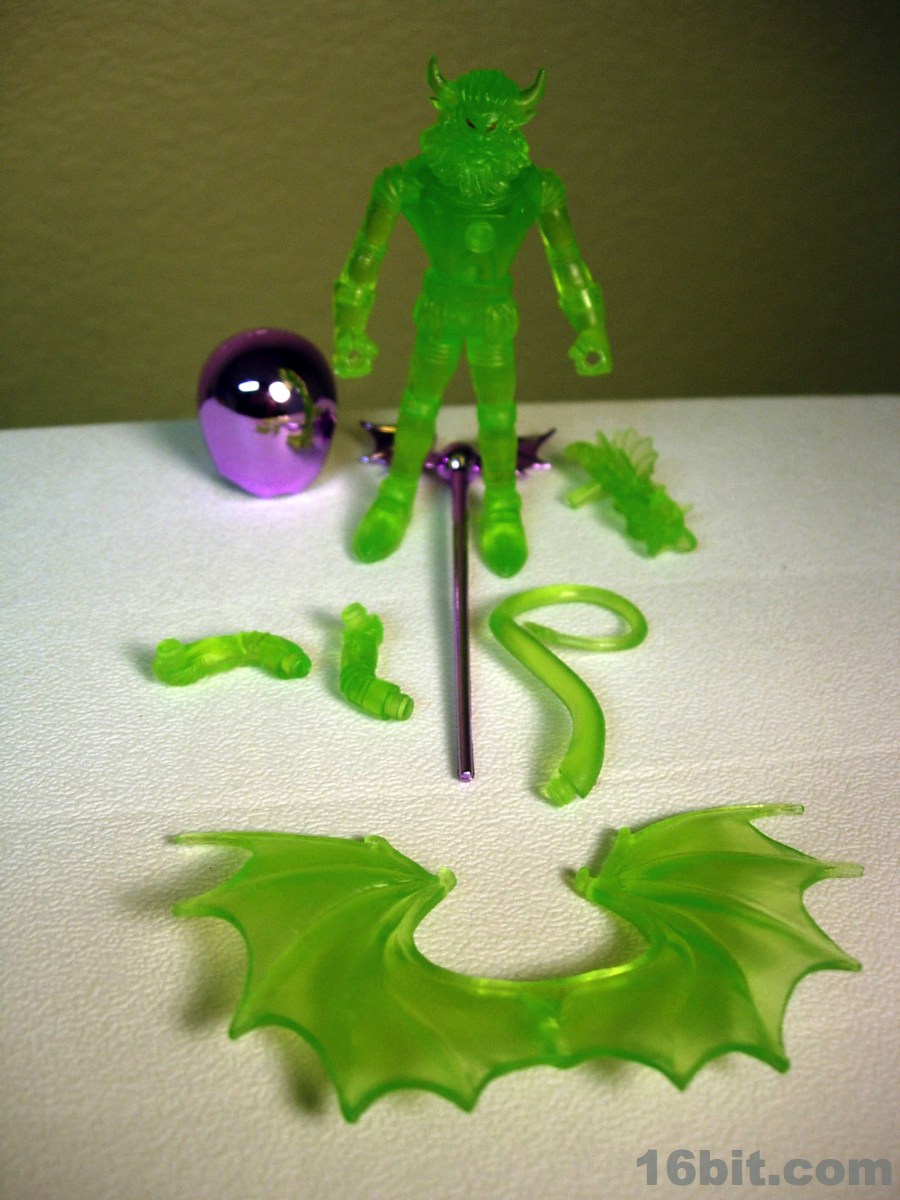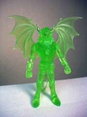 Because of Toy Fair in New York, figures like Mystron got written up a long time before they were posted-- this is what we call planning ahead. As the third release of the character, and technically the third pre-release as the painted version had yet to ship as of his release, this particular Mystron was cast in a bizarre green color. I say "bizarre" because, while appropriate for the Christmas season, I generally don't think of "green" when I think of "the center of the Earth" or, more specifically, Hell. Brown? Sure. Red? Absolutely. Smokey grey? Yes. But not green, even though it turns out the ghostly color really works well for this devilish creation.