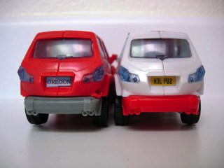 As a robot, he's acceptable. He looks like an unfortunate unfolded pile of chunks, which some attribute to the creeping in of the movie aesthetic. I think it's just bad design, panels hang off the figure and his head was oddly sculpted looking permanently down. The head itself is perfectly OK, with silver paint and a big red crest on top. Heck, he's even got a "H3L PU2" license plate, referring to the comics in which he and Megatron are merged into a single pathetic entity holding up a sign that says "HELP US" on it. I'd say that's appropriate for the figure, which looks like a mismatched pile of parts and probably is pretty miserable. It's not a lot of fun to transform and bits and pieces pop off during the conversion.