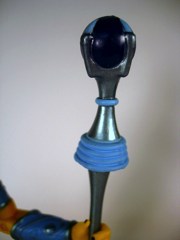 Modeled after the original Evil-Lyn toy from 1983, this release is also basically Teela with new paint and a new head. It's the right thing to do, toy-wise, but it doesn't quite perfectly capture the look of the character from the TV. Heck, none of them do, but she's still quite an amazing figure. Check out the crazy yellow skin, the blue armor, and the green eye shadow. This is an odd, colorful, and eye-poppingly neat design in its own right and a near-perfect update of the original toy. However, if you grew up watching the cartoon, you'd probably want the purple-and-blue outfit, which featured a cape, and was colored like the bulk of other human characters on the show. You can't win 'em all, but she's still neat.