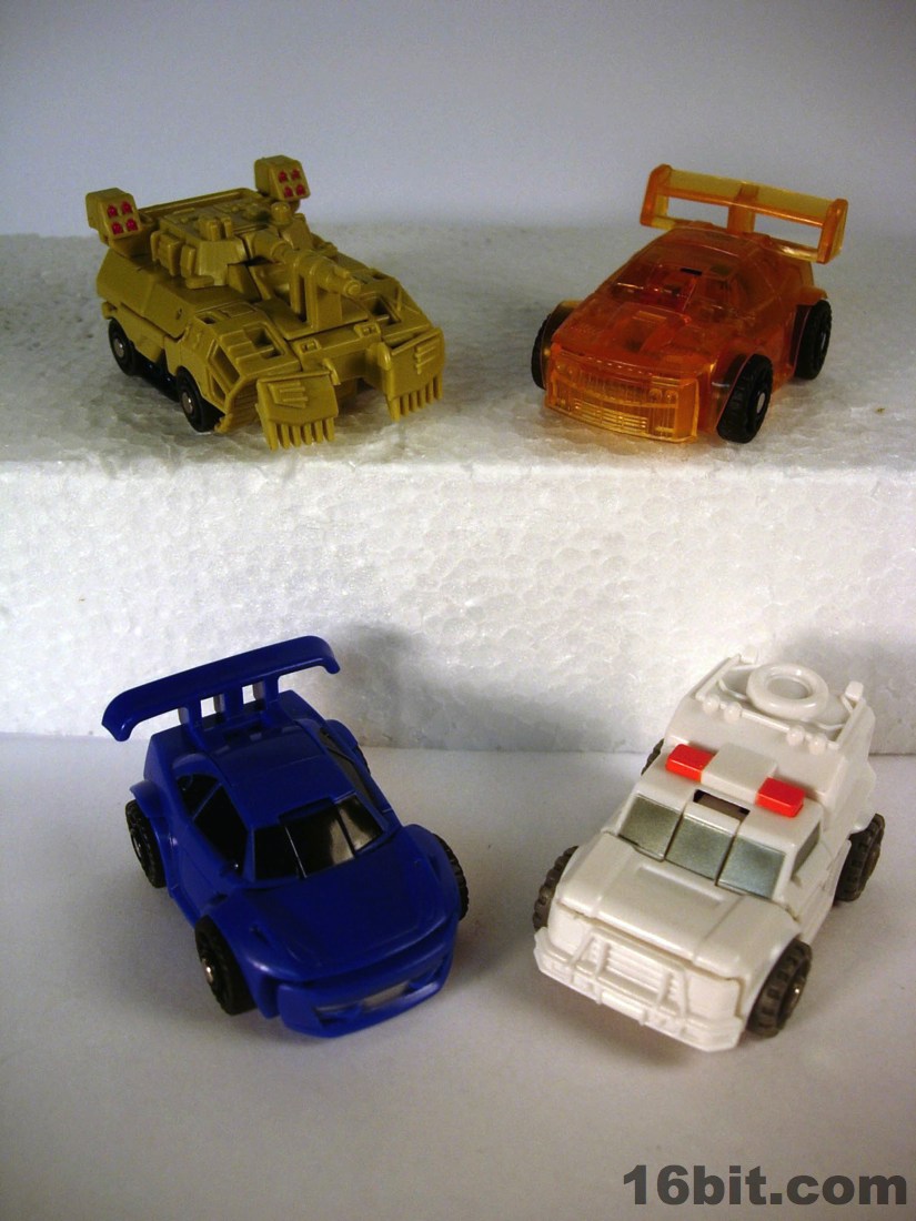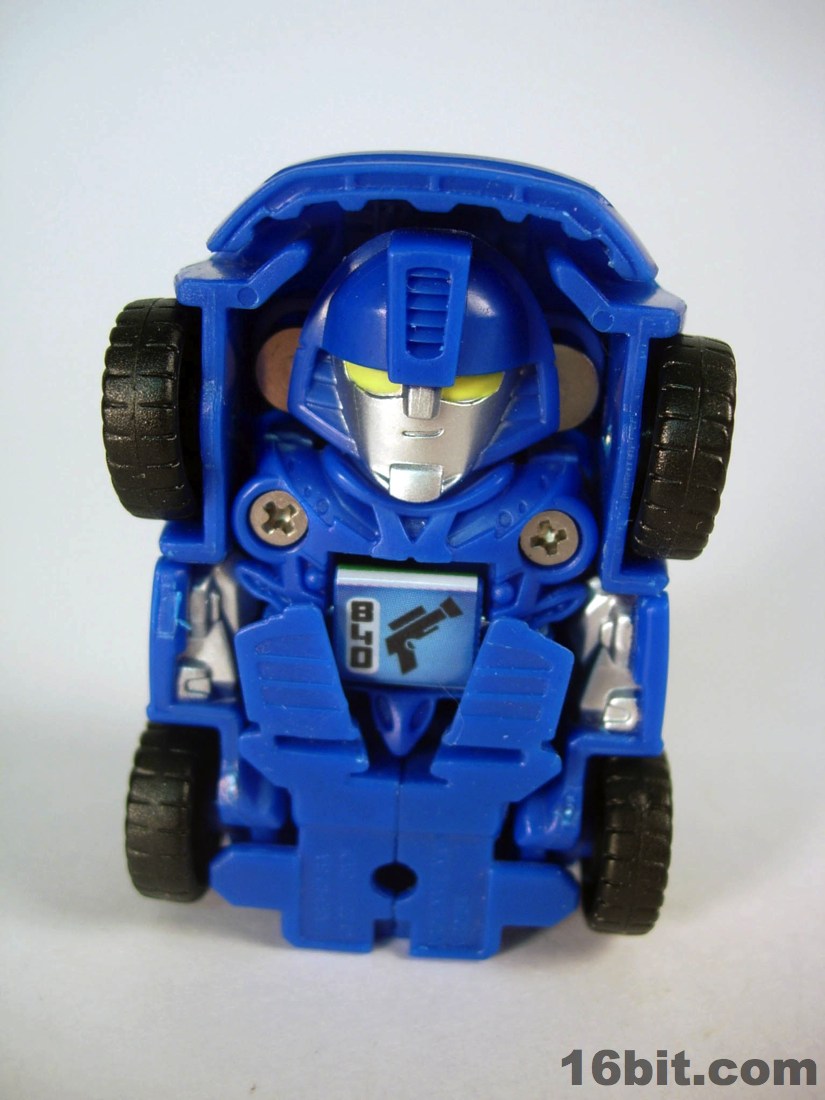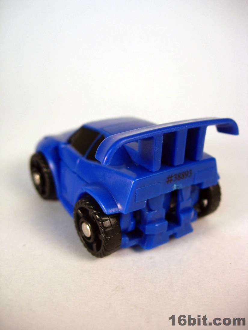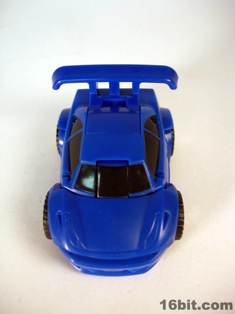 Packaged in robot mode, transformation is painfully easy. Just fold in the arms and feet, fold down the hood, and presto-- you're done. Two transform it into robot, just hit the bumper-- it'll jump into robot mode, and if you hit it just right, he'll even stand up.