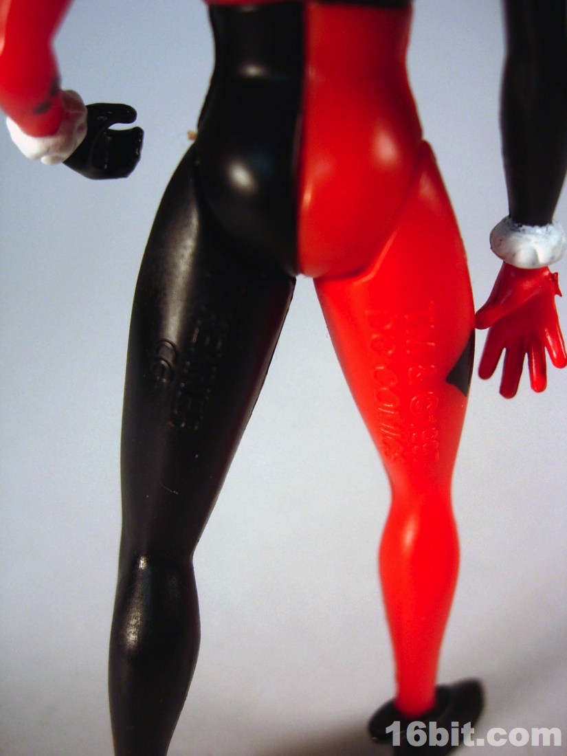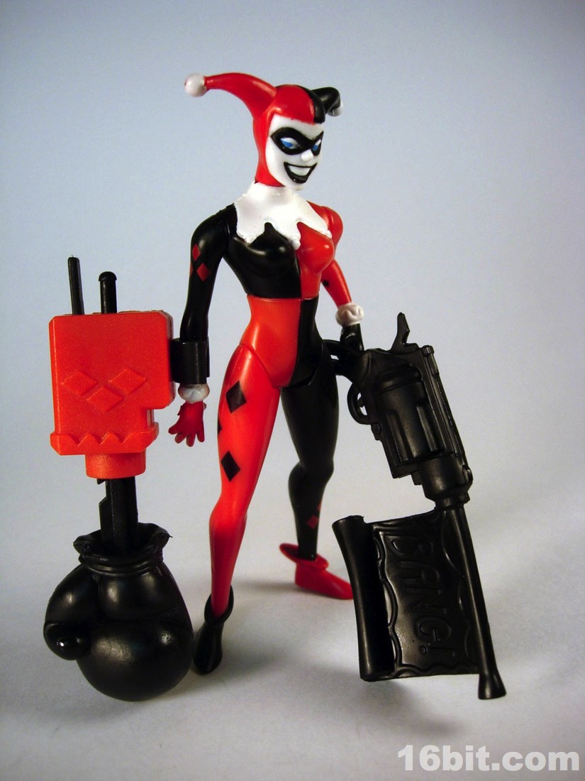 The simplified style from the TV show made for great Kenner-style action figures. Limited articulation meant the silhouette of the character could be kept intact quite nicely, while keeping the poses more or less restrained with a few exceptions like the Phantasm and Poison Ivy. Harley's right hand is extended in an unusual-for-a-villain pose, but I quickly noticed it seemed she was designed almost perfectly to compliment the Joker from the same wave. The two could hold hands-- I assume this was intentional, which is nothing short of adorable. Her arms could move freely, as could her neck, and her legs had an acceptable range of movement. While she had no holes in her feet for pegs, which was unusual for this line, she generally had no problems standing unassisted. However, her accessories made her too top-heavy and as the packaging said, some poses would require hand support.