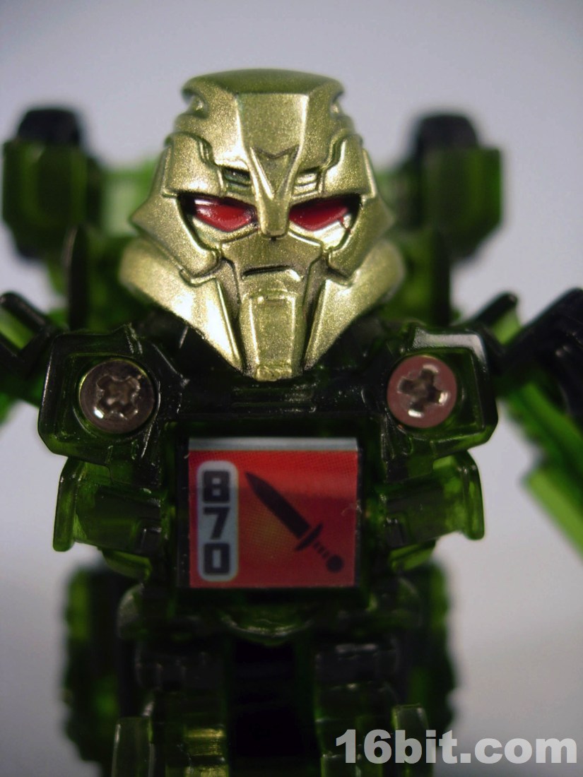 Few clear Bot Shots are effectively "new" figures, Megatron is a really interesting mix of existing and new parts to make a figure which is, well, new. A painted version of this mold is due in wave 5, but this one is out right now. The head is similar-but-slightly-different from the previous Megatrons, with a new "trailer" piece and a recycled body from Optimus Prime. The end result is effectively Dark of the Moon Tanker Megatron, except cast in clear green plastic with a little bit of paint. The robot mode is, well, here it is. Standard non-articulated design with a lot of paint on the head, for a change.