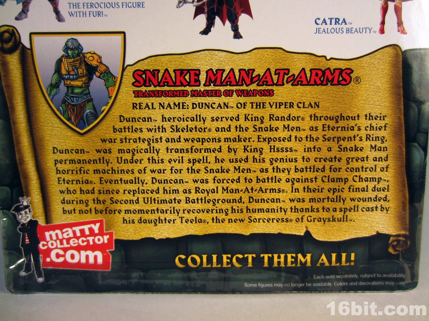 The character Snake Man-At-Arms comes from a 2003 episode of the Masters of the Universe cartoon in which Duncan gets turned into a snake man, temporarily. The idea was to bring him back that way permanently as the Snake Men vehicle designer, and to some extent this was explored in a comic book which came packaged with the DVDs of the show. The Classics fiction takes it a step further by not only transforming him, but letting you know he dies. So along with the Sorceress, they slowly seem to be killing off a few of the heavy-hitters from the original series but at least we got a decent action figure out of it.