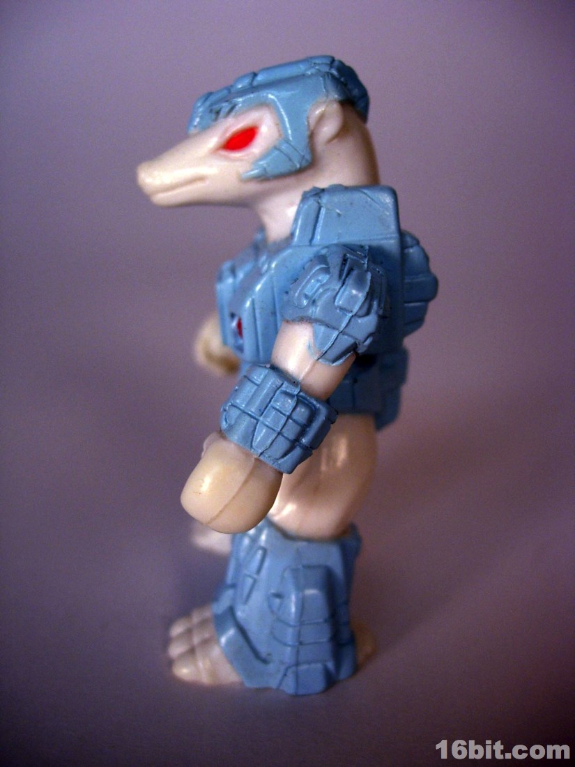 With two points of articulation, the figure can stand with no problems and holds his weapon just fine. He has a nifty smile, and tons of sculpted grooves in his armor. Red eyes really pop out of the head, and I would wager black eyes would have looked more adorable. (Note to Takara: if/when you do your dirt-cheap reissues, please redecorate the figure with black eyes and a black nose.)