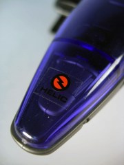 The robotic vehicle is inspired by an alligator, albeit an electronic futuristic one. The figure lays on his belly to reach the controls, which also have a slot for the figure's dart gun weapon. The dark blue, clear plastic shield covers the figure's body and is a sharp contrast to the mostly silver robotic vehicles sold in Japan. He has a wind-up motor, posable tail, and-- this is what really gets me happy-- an extra tail gun. The tail gun is cool because it can be rotated and the figure can "grip" it and "shoot," making the vehicle something like a bunker. Amping up the fun factor, the tail on Neptune has Zenevas kill marks, and a HELIC Combat Team symbol on its head complete with the name spelled out. I just like that sort of detail.