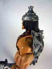 While technically a concept He-Man figure, Vykron borrows the original concept art for the character and applies it to a new character with a new name. Rather than being the most powerful man in the Universe (or his grampa) Vykron is an Eternian Champion, which is to say a Gladiator, which is to say Eternia's WWE. The alternate outfits are basically vanquished foes, or alternate costumes ala Mick Foley. The main outfit is the barbarian, which was how the figure was packed out for Comic-Con 2012. (The other versions were sold on Matty Collector a couple weeks later.) Borrowing heavily from the stock He-Man buck, Vykron gets new hands and forearms, plus a new head. The costume elements are new, his vambraces are snap-on accessories over his boots and the furry cape/harness pops on and off like all the rest. Particularly interesting is his helmet and hair, which are a single, removable piece which can be replaced for the space outfit's helmet. (The tank head is a complete head and must be swapped completely.) Vykron's barbarian weapon is a mighty axe, which is, unsurprisingly, quite cool. My only gripe about this mode is the black paint from the hair dried on the human head and at least on my sample, it can look sort of ugly without it. Solution: leave on a helmet at all times.