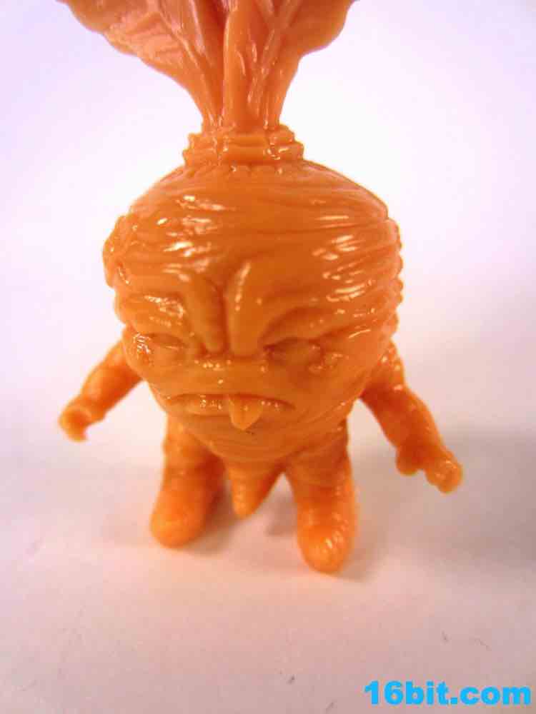 For some reason, recent toys have eschewed traditional copyright markings where you get a year plus the name of the studio, or licensor, or toy company. The young Baby Deadbeet is brimming with sculpted detail but has absolutely no identifying marks, so if a future collector finds this figure and has no idea what it is, I suspect they will have some degree of difficulty locating a name. (Heck, the same is true for all of OMFG.) Standing about 1.6-inches tall, the figure has two beady little eyes, a tongue sticking out, a pair of crossed bandages on its head, plus a generous helping of wrinkles and warts. He stands just fine on tiny legs, and has some of the smallest sculpted plastic hands I've seen on a collectible figure. Even more fascinating, the tiny vegetable has what appears to be a cleft in its butt region, down the back of the tail. It's a small detail, but along with the wrinkles and changing textures near the stem and leaves it's appreciated.