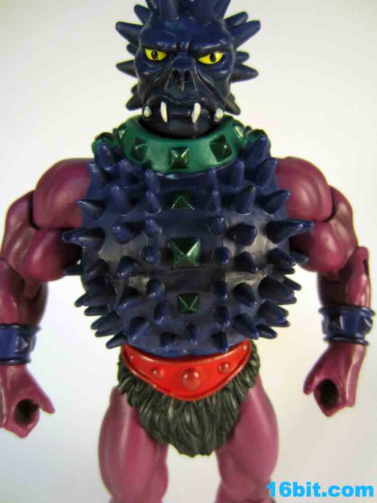 The head is nice and mean, expressive and purple. He has a sour expression and bright white fangs, plus yellow eyes which look really great. They did a great job replicating the old "hollow head" look with sturdier materials. To add some color to the outfit, metallic gold on the armor helps the outfit "pop" a bit. Other than that, the figure is built off a more or less standard MOTUC buck with unique bracelets.
