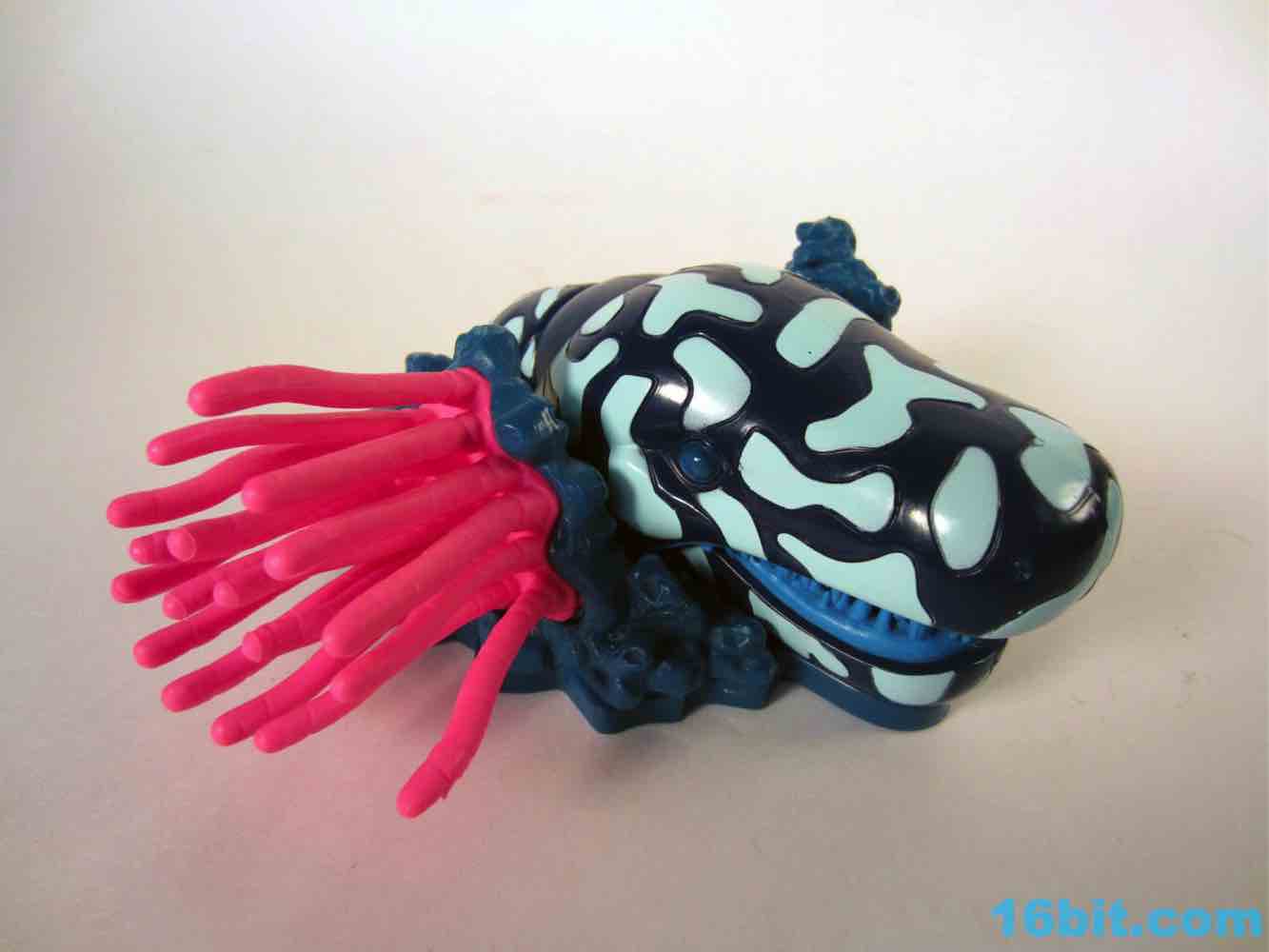 The playset is the main reason to buy the set, as the figure is basically half of a $5-$6 2-pack. While the other playset released here had numerous moving parts, reviews on Amazon were pretty abysmal. The Murena Den had no reviews on Amazon, but I can tell you it's a much sturdier and better-made toy that does a heck of a lot less. The thick plastic feels like it could take a beating, with rubbery "sharp" teeth and gums plus a pink coral trap off to the side. Mine had a fine, light whitish powder collect over the rubbery blue parts when I opened it in April of 2013... after I kept it around for about three years in the box. It cleaned right off with water using my shower head.