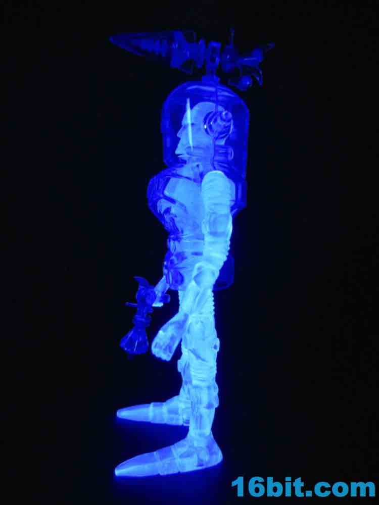 As one of the final unproduced "original" Outer Space Men, Gamma X benefits from years of history and is a bit of a toy legend in that the original 1969 prototype didn't yield a mass-produced toy until this one. For those dying for a Gamma X figure of their own, truly it is a great day. For those just wanting a neat figure, it's OK. Feeling like a mutation of the previously-released Electron+, the concept of a man from beyond time was a sound one - the original concept of a glow-in-the-dark figure in clear crystal armor - but as a clear unpainted guy in a blue suit, the complete package is just not all that exciting. Individual components, on the other hand, are pretty amazing.