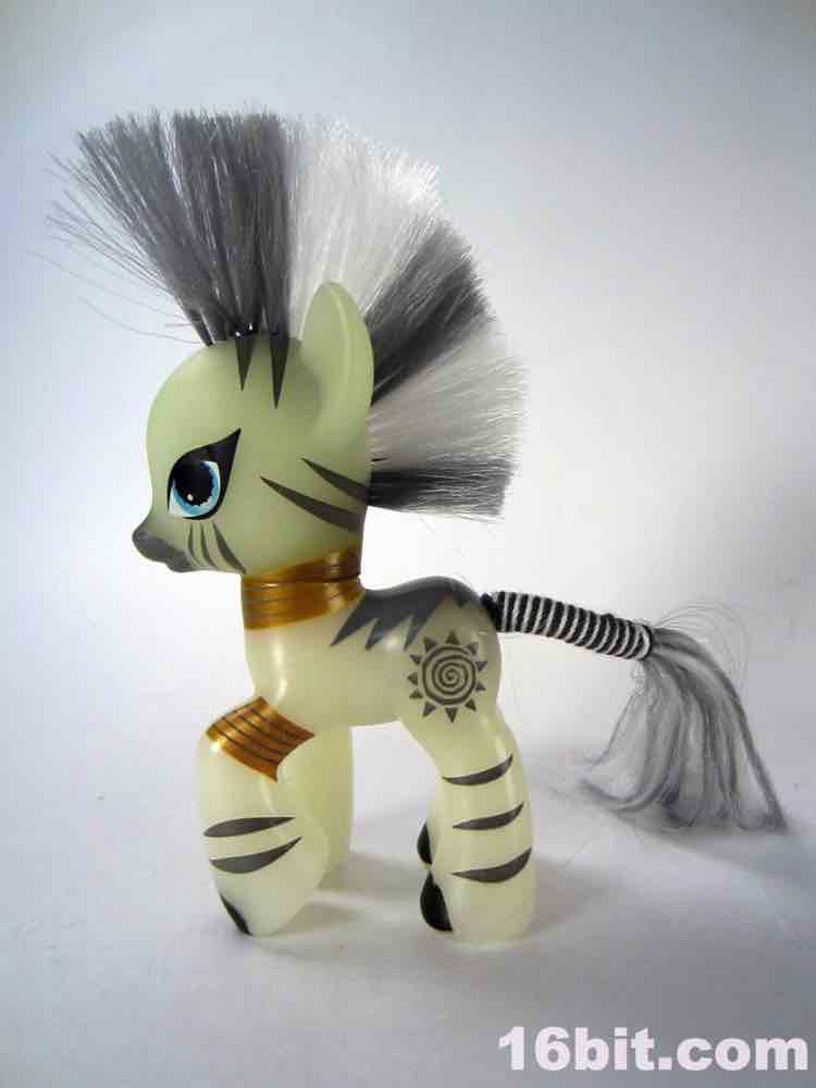The figure is a basic, more or less plain pony body in glowing plastic with painted jewelry. A mini-figure version of the figure had fully-sculpted earrings and other elements, so this figure's most distinctive non-deco elements are the braided tail and striking, severe haircut. The deco is sharp, with grey stripes on her skin, and a tri-color eye that just turned out perfectly. Her "cutie mark" is a sun design that looks like it came out of The Lion King, although for all I know it's based on an actual African symbol and I'm just an idiot.