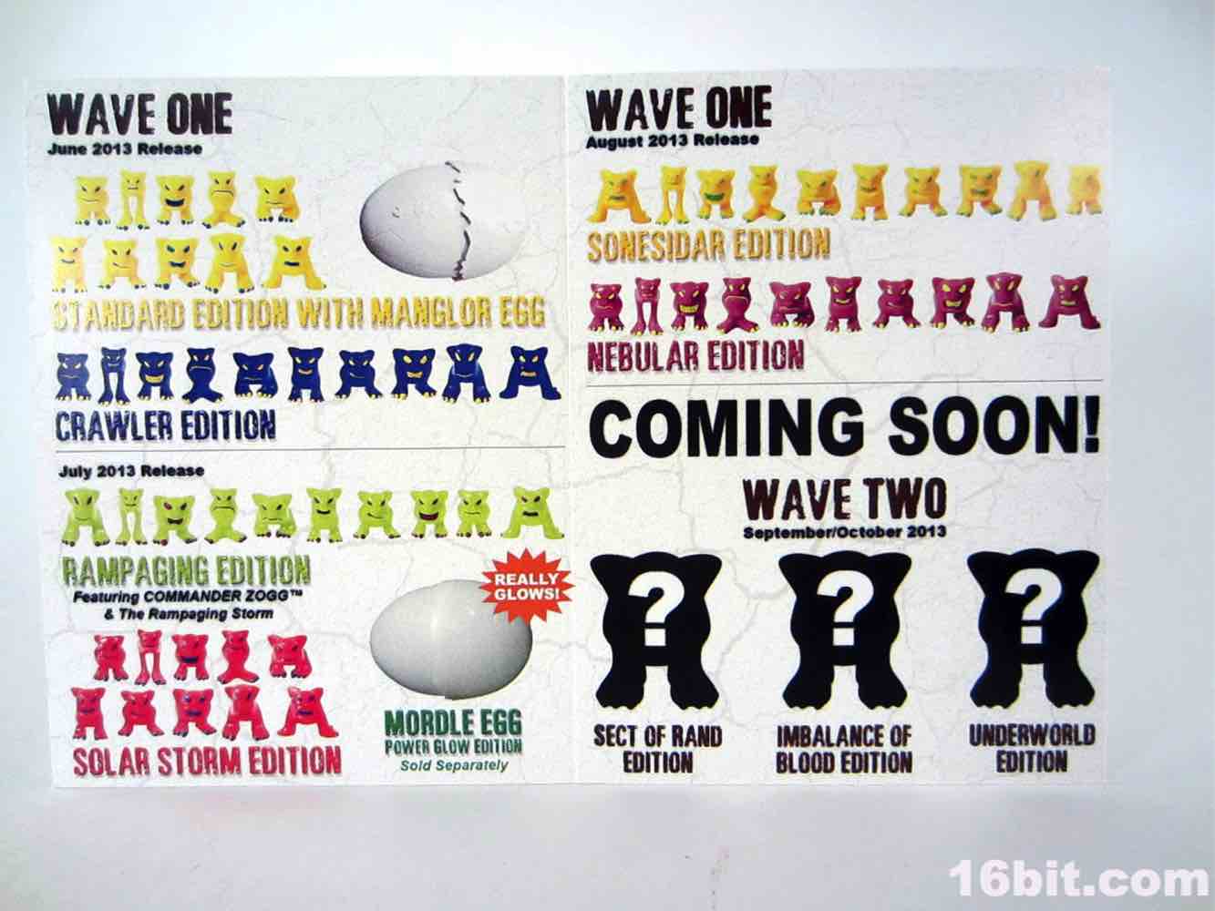 The Checklist Card was a neat wrap-up and sneak peek of the company's wares - both eggs and all six colors of Mordles were shown, as were silhouettes of the three new colors - Sect of Rand, Imbalance of Blood, and Underworld editions. The back also teased Robo-Force's Maxx Zero, which as of my writing this has yet to be shown to the public. (You in the future have seen it and probably have one by now.) The card itself is of a nice cardstock and has a fold down the center, for those of you who would do such a thing. Mine is staying in the envelope once this article is done.