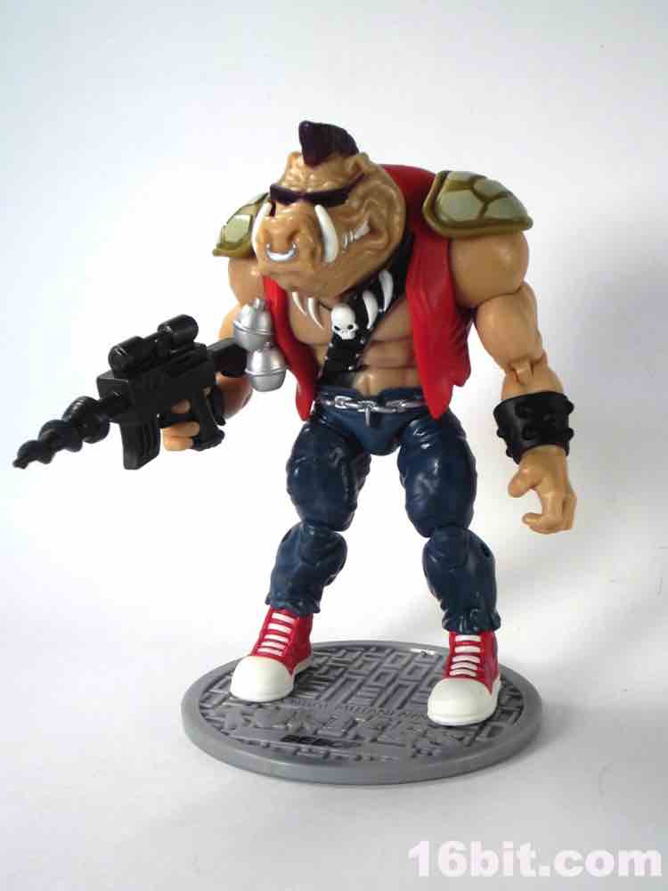 Standing over 6-inches tall, the figure is a bizarre amalgamation of a modern Marvel Legends/Mattel Classics figure and a chunky, squat 1980s action figure. It's also slightly smaller than it should be relative to the green teens, making it a little less threatening and harder to buy as a bad guy. Bebop retains elements of the TV show, but those animation models were a little skinnier and had slightly more human proportions. This version of Bebop barely has a neck, but it does retain the ammo bandolier, red vaguely Chuck Taylor sneakers, and red vest. The pants are the wrong color, but whatever, it's "inspired" by the original TV show and not a direct adaptation. (Otherwise the turtles would look too goofy.) While it's not entirely accurate to any existing incarnation of the character, it does look appropriately close enough to them that I don't think anyone is going to mind too much. Well, except the ponytail - I really do miss that being here. The face doesn't look too close to the toon, but it certainly looks like something that came out of Playmates before 1990. It manages to fail at replicating anything too accurately and what you're left with is a 2010s version of a 1988 figure.