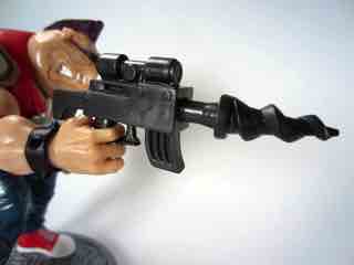The figure plugs right in to his display stand and he has no problem holding his only weapon, a gun. Given the increased price I feel like I deserve more - it's not like Playmates splurged on articulation here. Bebop is quite good with bend-and-swivel wrists, but the rotating neck movement is superbly weak and the grand total of joints is 20. 20 sounds like a lot, but the whole thing feels like an unfinished factory test, especially compared with last year's "toitles." The shoes swivel around, but don't pivot at all. The legs can't swing forward easily, and feel a lot like hindered versions of the original 1980s figure hips. The double knee joints are nice but don't really add much to the figure's ability to be posed. The double elbows are a nice touch, and work well. His hip joint is, in a word, worthless. He can't twist more than a few millimeters and there's little "pivot" to help him hunch forward.