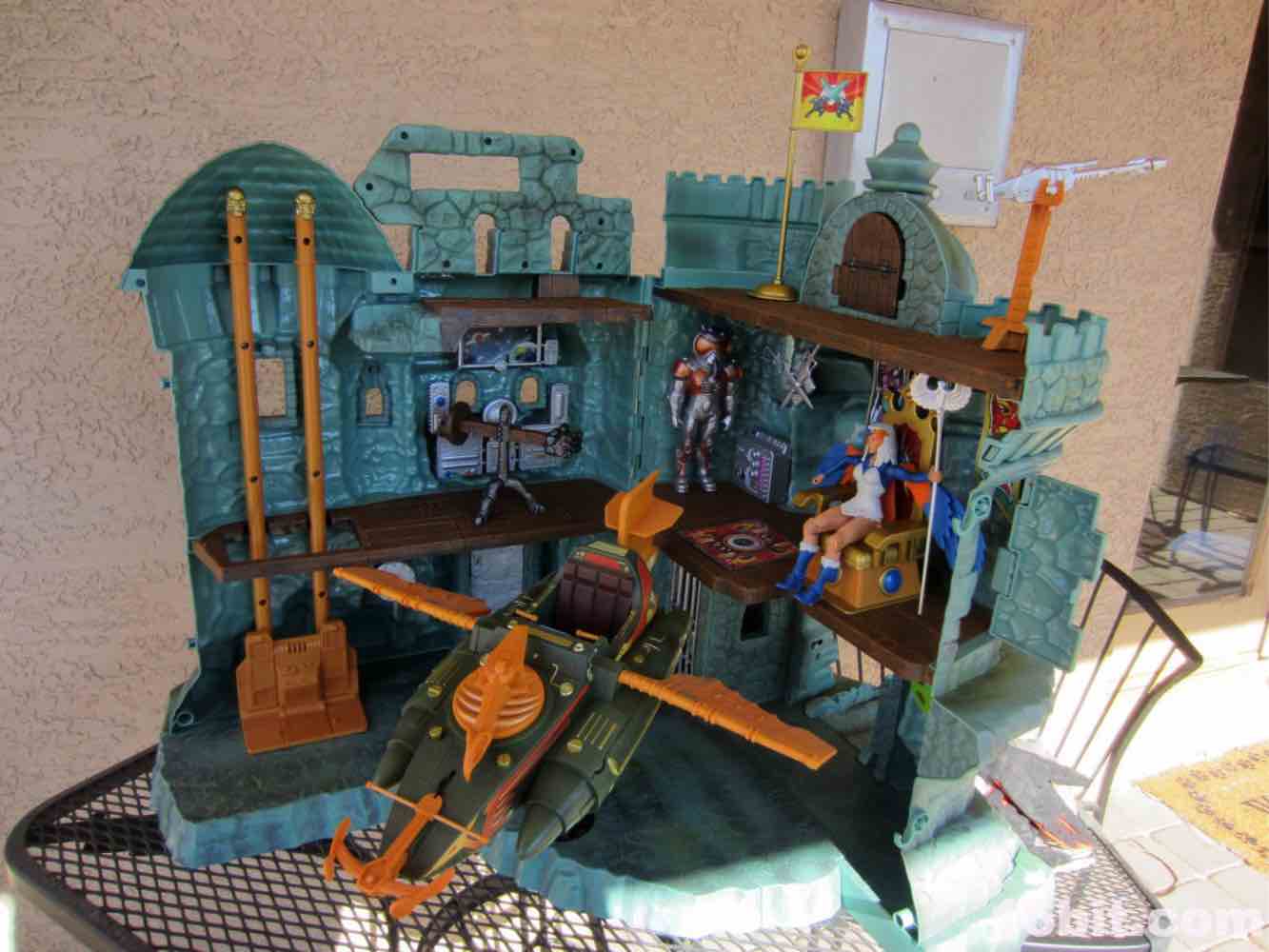 What I didn't care for: One, the prison cell (a nice addition) isn't tall enough to easily get a figure in there. Acrobatics are required. Three, the flag just sort of sits there - it doesn't fasten in place. Four: the throne has difficulty holding most figures that aren't the Sorceress, so if you want Skeletor to take over the castle it looks like he's going to fall off the chair and into some pit below. Five, the place for the stand for your Wind Raider, if you don't put your Wind Raider in there, is a big ugly hole. Fans are already making manhole plugs for it, and I hope Mattel follows suit in a future Weapons Pak. It needs a cover or some other thing to plug the hole. The Wind Raider stand is also an incredibly tight fit - it's nearly impossible to remove without creating stress marks. (I created stress marks. This angers me.) The Wind Raider is also in the way of the lower level of the ship - part of me wonders if this was a corporate mandate to include Wind Raider interaction, because, really, no. Just no.