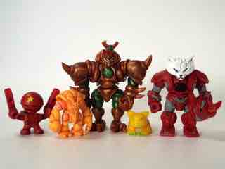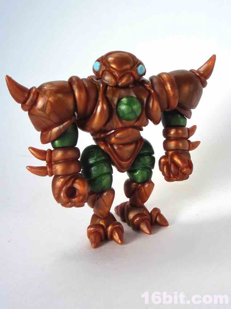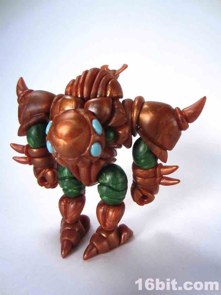 According to a trading card packed with the Mini-Mushi horde, Matt Doughty of Onell Design conceived of the design and Mr. Hansen did the sculpting, prototyping, and other production work. The end result is a gorgeous action figure that looks lively with its metallic finish, but at the same time gives me convulsions because I also collect Transformers and am keenly aware of problems as recently as 2000 with Gold Plastic Syndrome. We haven't heard of any reports of crumbling Glyos figures yet, but it's too soon to worry about that happening. It may never happen - it's just the kind of thing that makes me nervous, and will make me buy non-metallic brown Kabuto Mushi figures if those are ever produced. I'll play with those ones. Marty - consider MK II Kabuto Mushi figures in normal, boring brown and green plastics.
