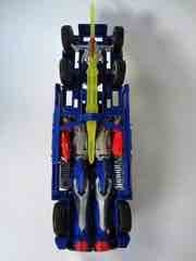 The 10-inch long Western Star alt mode ain't bad. It's not fantastic, but it has chrome to distract you from the uneven red flame paint job, the odd yellow windows, but bits and pieces are begging for paint or Reprolabels upgrade sticker sets. The step near the door is unpainted blue, as is pretty much the entire back of the truck - the deco is slightly better than the simpler Cyberverse toys. If you compare this to the candylike gradients used on the deluxe Dark of the Moon Optimus Prime, this comes up short. This is not a facetious, flippant fanboy complaint - there's just not a lot of paint here. The hubcaps are molded in grey, the tires are more rubbery than the typical hard plastic we see, and you can plug the weapons to the toy without too much of a fuss. I should note the wheels do not roll particularly freely, and my sample rolls maybe 3-4-inches on a desk if you give it a good, strong push before coming to a halt.