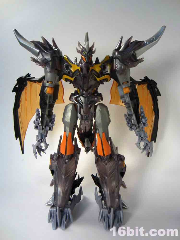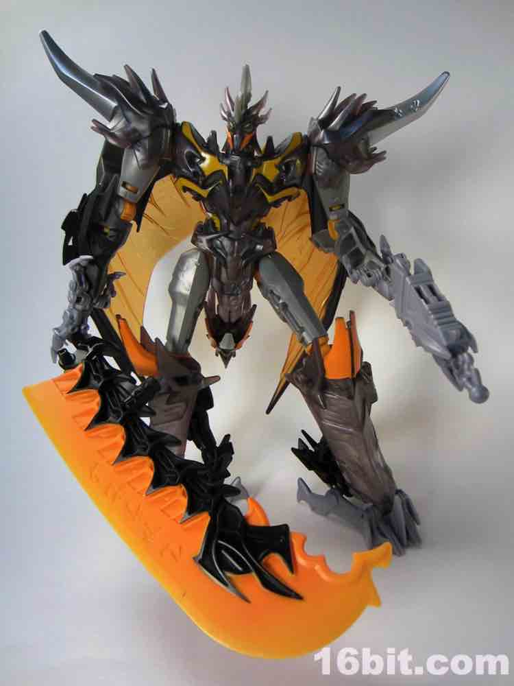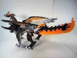 The dragon mode is huge - obscenely huge. Since Hasbro got this out at the intent of making it a $20 figure, it will no doubt serve as a sort of a benchmark for what fans expect in the future. Seeing this toy come out just before the new movie toys will give fans unfair expectations - none of the new guys are this big or this cheap. From head to tail, the dragon is about 14-inches long with an even wider wingspan. He has limited leg articulation, with 2 joints on each wing and a tail made of the giant sword. You can plug the cannon in the dragon's back, but shooting it may prove tricky. While it's not filled with features or action elements, it's a sizable creature for the price - I doubt it'll displace Transmetals II Megatron or Cybertron Scourge as America's favorite transforming dragon, but it's certainly bigger and less fragile.